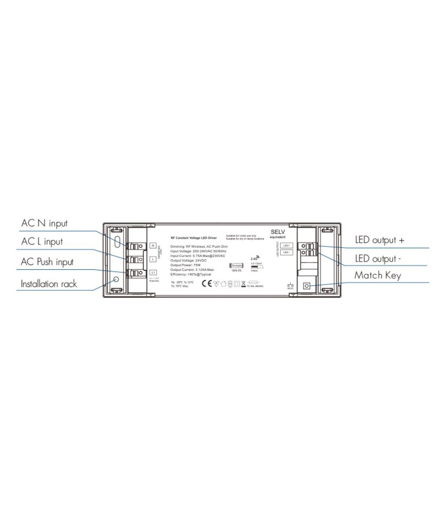 Strømforsyningen er dæmpbar, hvilket gør det muligt at justere lysets intensitet og skabe den perfekte atmosfære til ethvert rum. Den integrerede RF og push-dæmp funktion gør det enkelt at kontrollere belysningen.