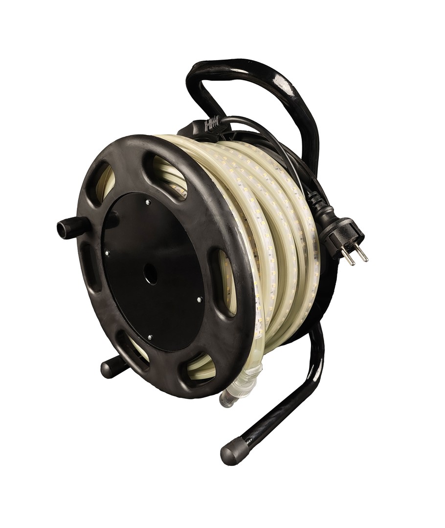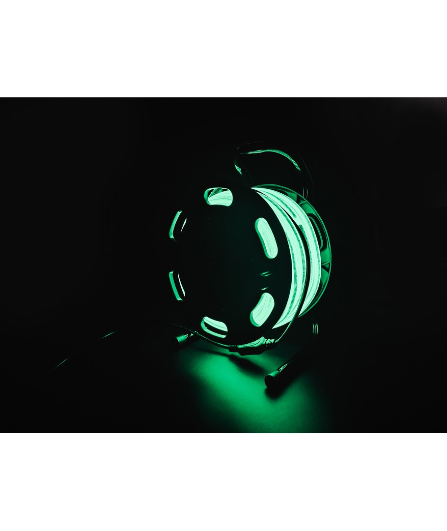 Få både kraftigt arbejdslys og nødlys i ét produkt! Denne 25 meter lange LED strip med tromle leverer et stærkt lys, når den er tændt, og lyser selvlysende grønt, når den er slukket – perfekt til byggepladser, garager og udendørsarealer.