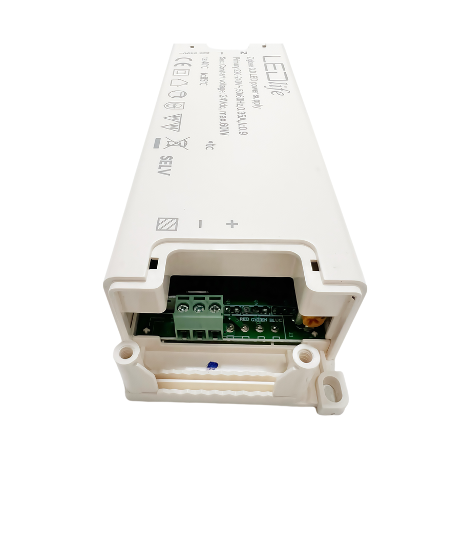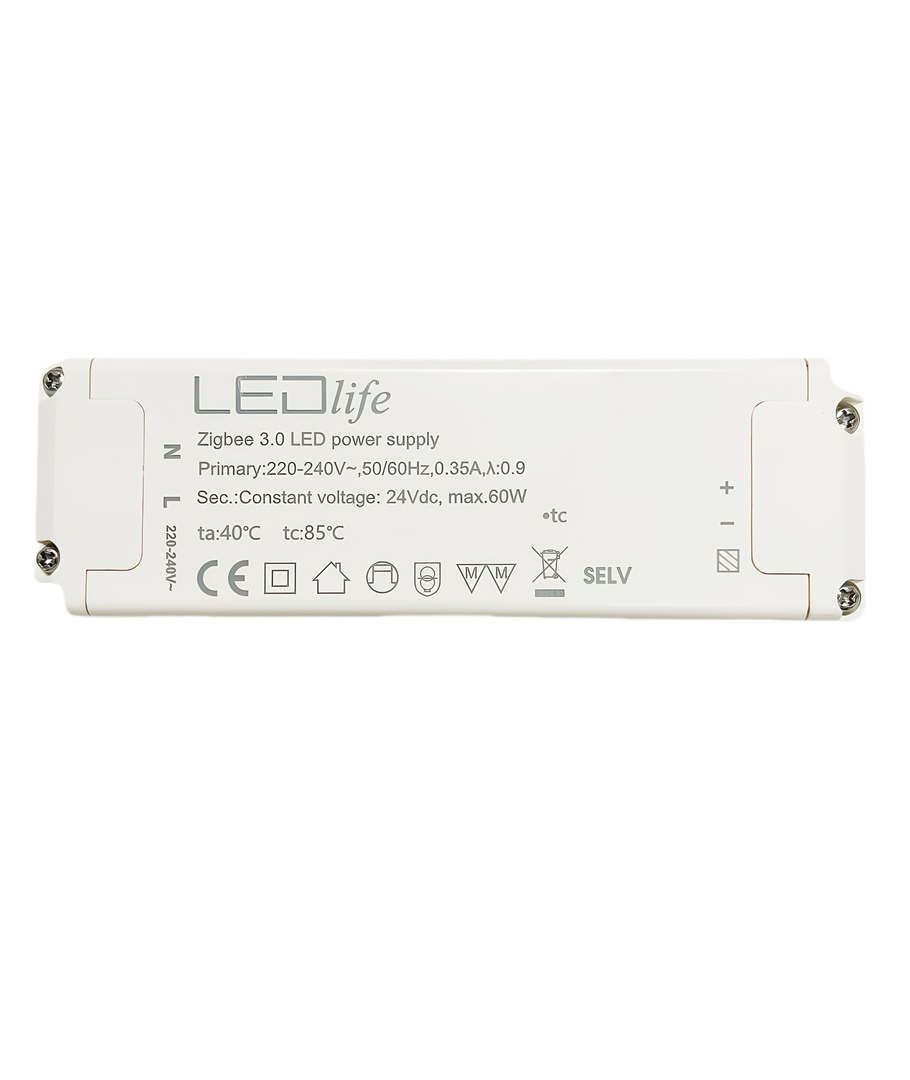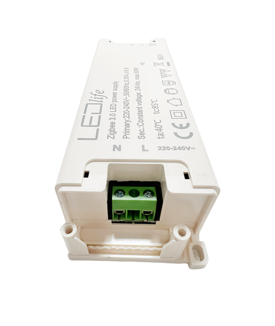 Denne 60W strømforsyning er designet til dem, der ønsker at integrere deres LED belysning med Zigbee-systemer, herunder Hue-kompatible opsætninger. For at gøre installationen nem og problemfri, tilsluttes enheden direkte til din 230V forsyning, og den leverer en jævn strøm på 24V DC ud.