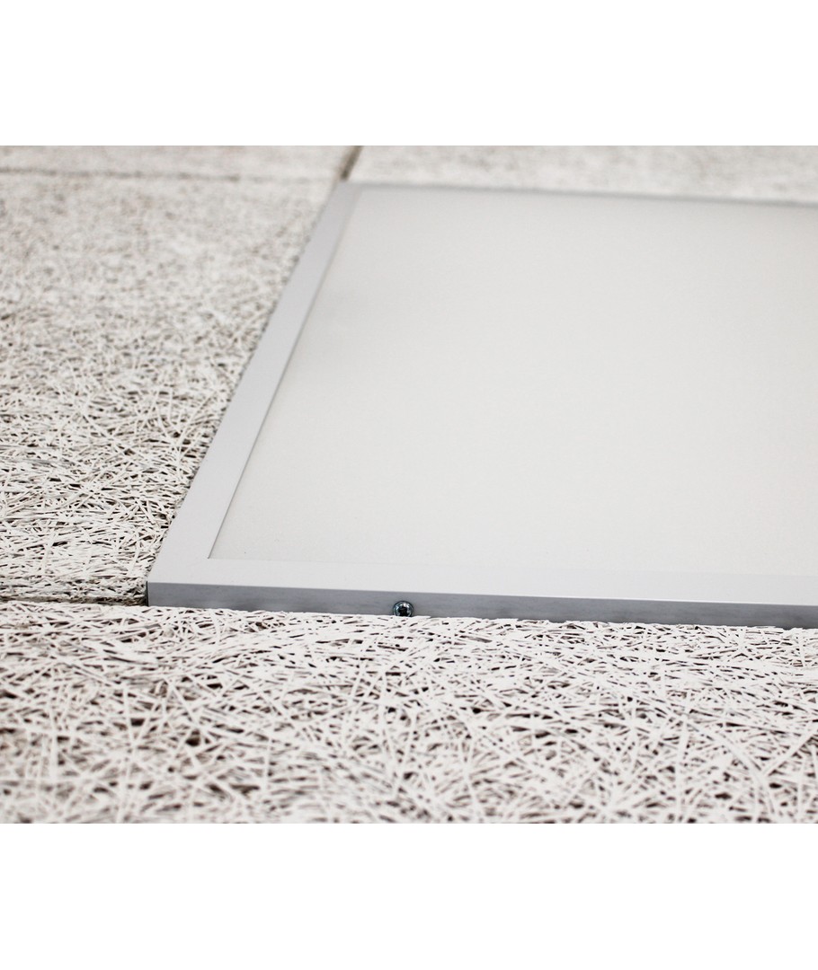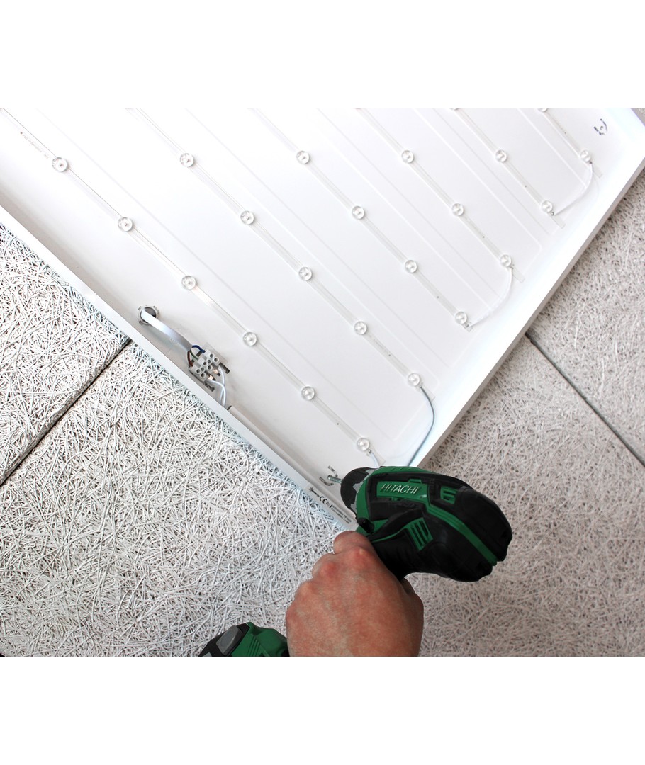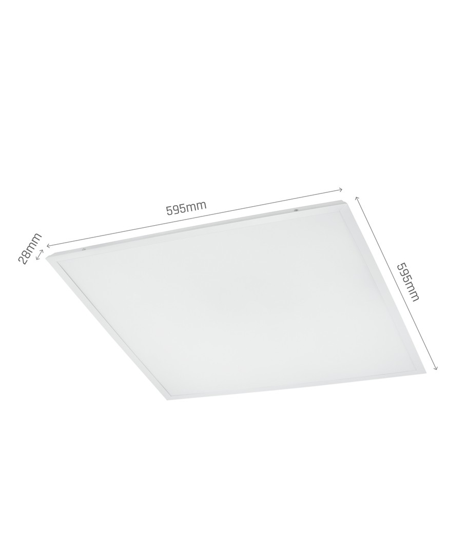 Designet til at passe nemt ind i ethvert loft med målene 595 x 28 x 595 mm. Panelet kommer med en hvid ramme, der gør det muligt for en direkte montering uden behov for ekstra indfatning.