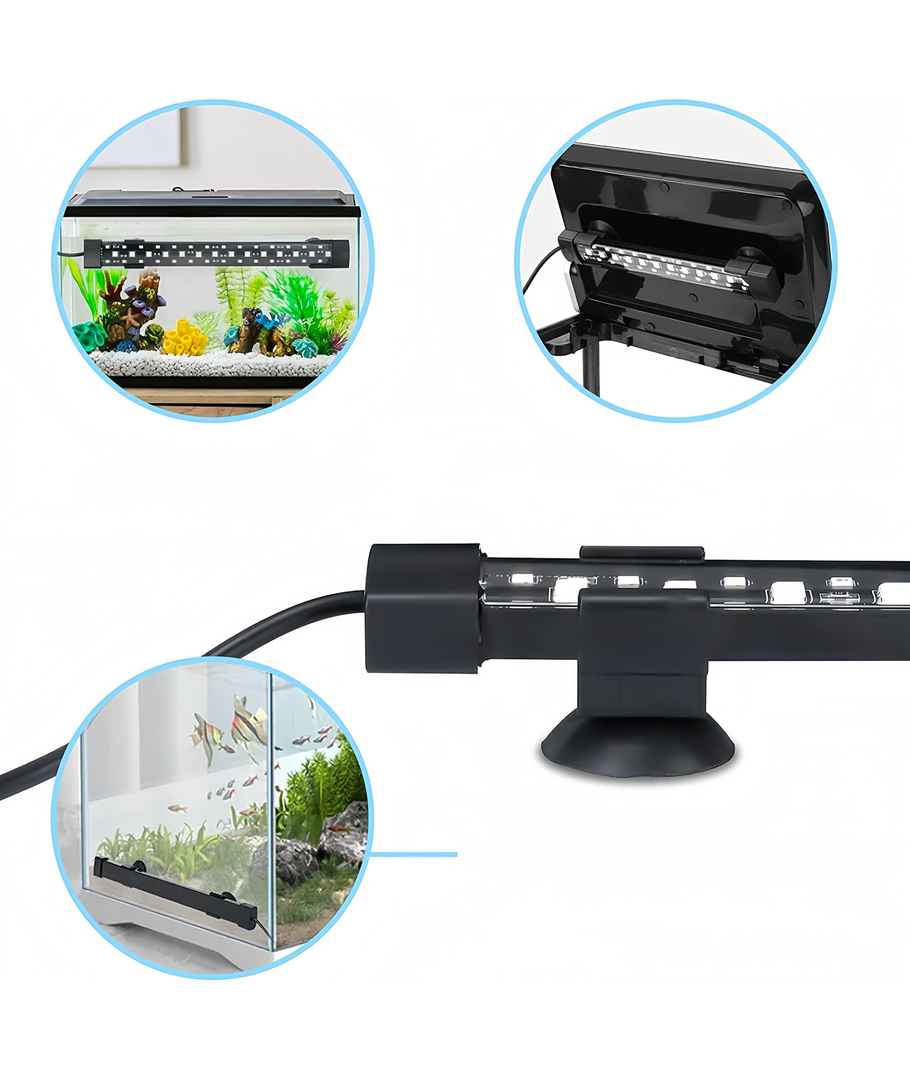 Dette 20 cm lange akvarie armatur med 8W LED-lys er designet til at forbedre din akvarieoplevelse med avancerede lysfunktioner og brugervenlighed.