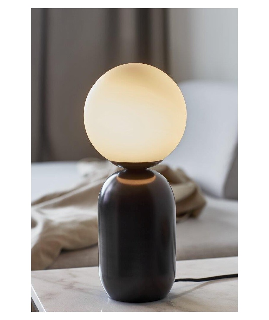 De veldrejede former resulterer i en nydelig bordlampe, der afspejler et elegant design. Samtidigt står den maskuline fod i mat grå metal i flot kontrast til den fine kuppelformede glasskærm, som bidrager til visuel volumen og et blødt lys.