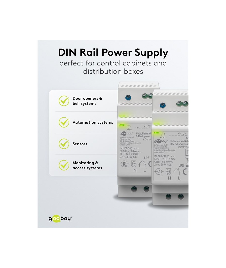 12V DC 2,5A strømforsyning til DIN skinne montering.