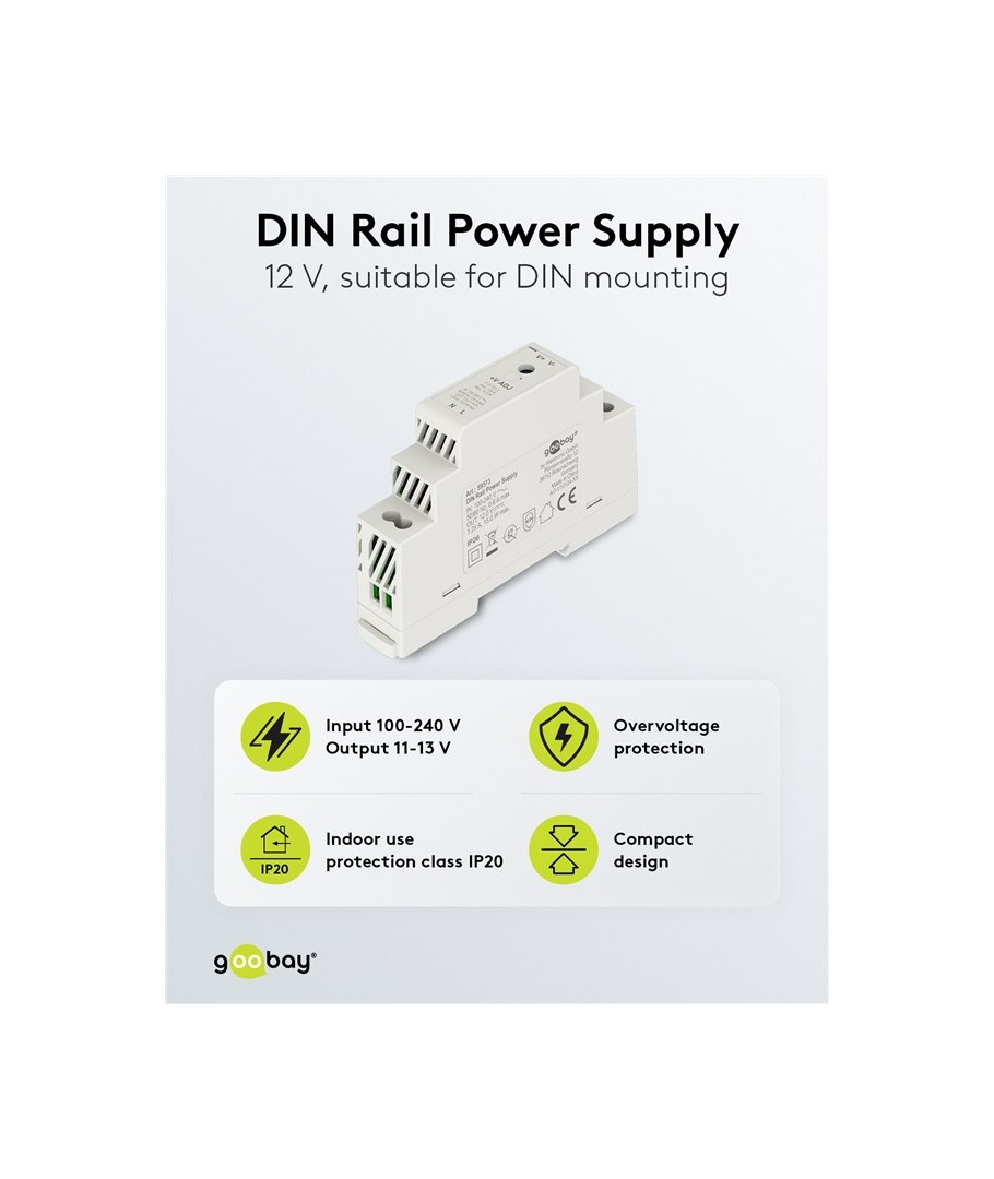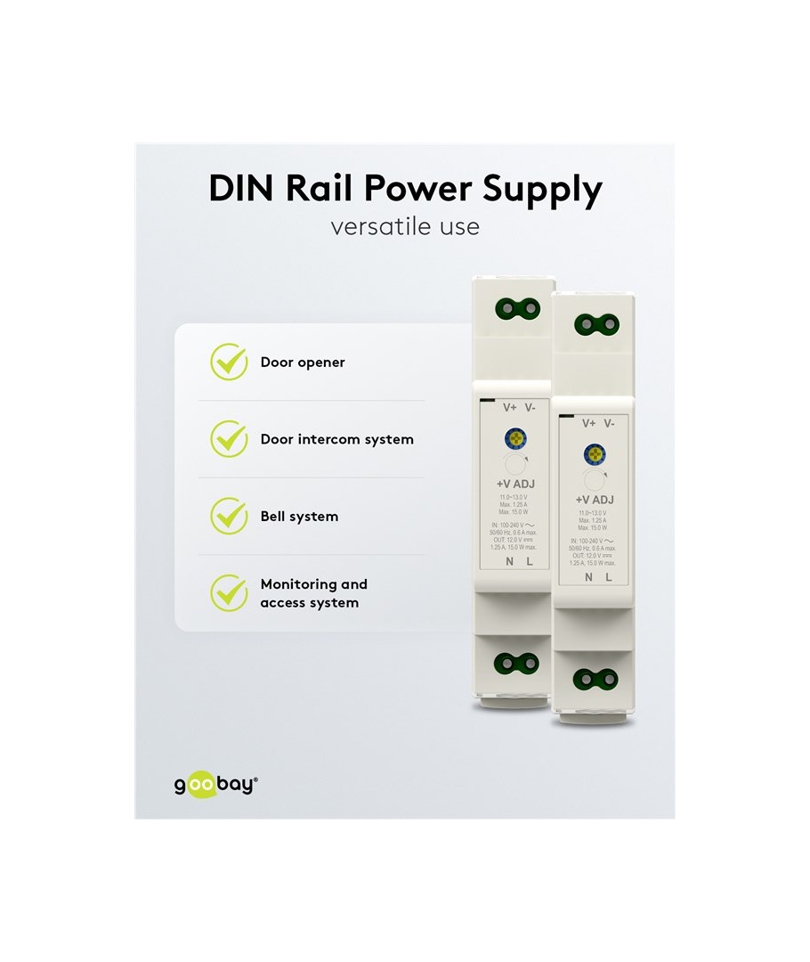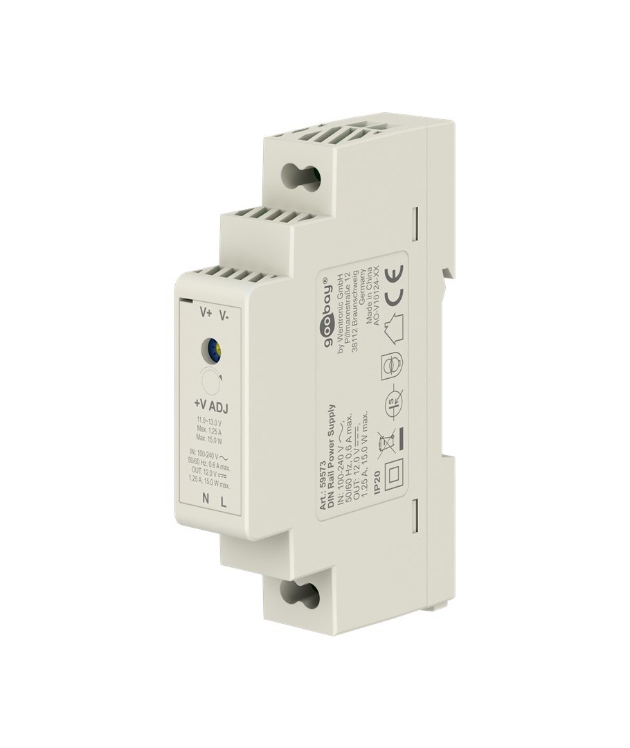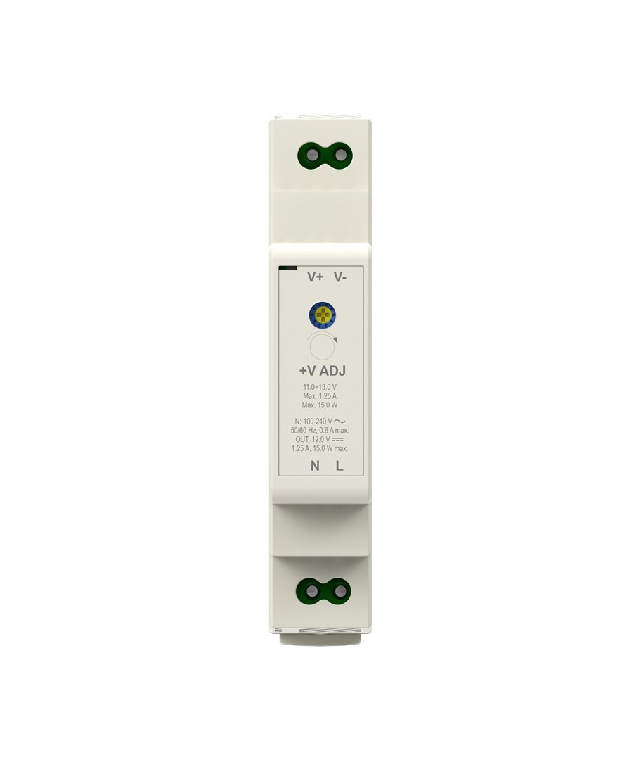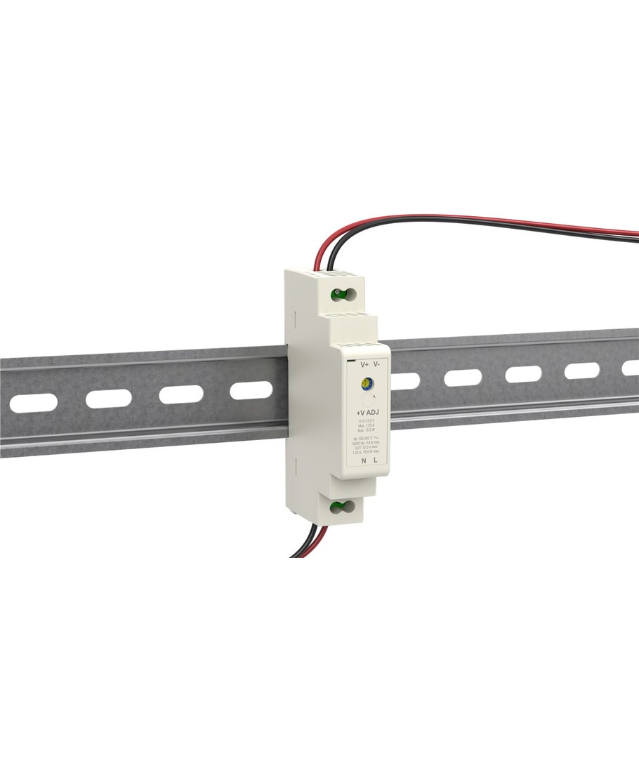 12V DC 1,25A strømforsyning til DIN skinne montering.