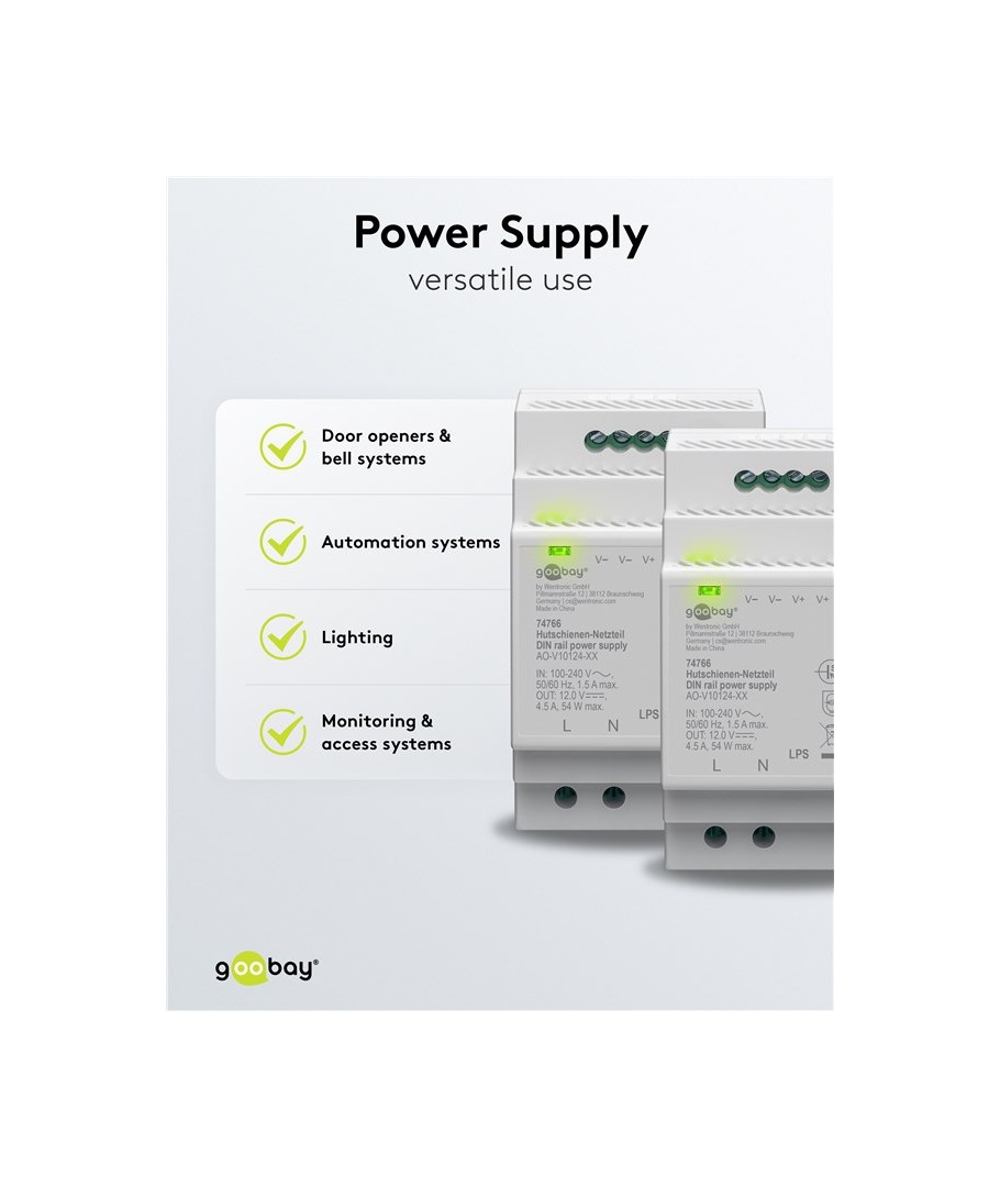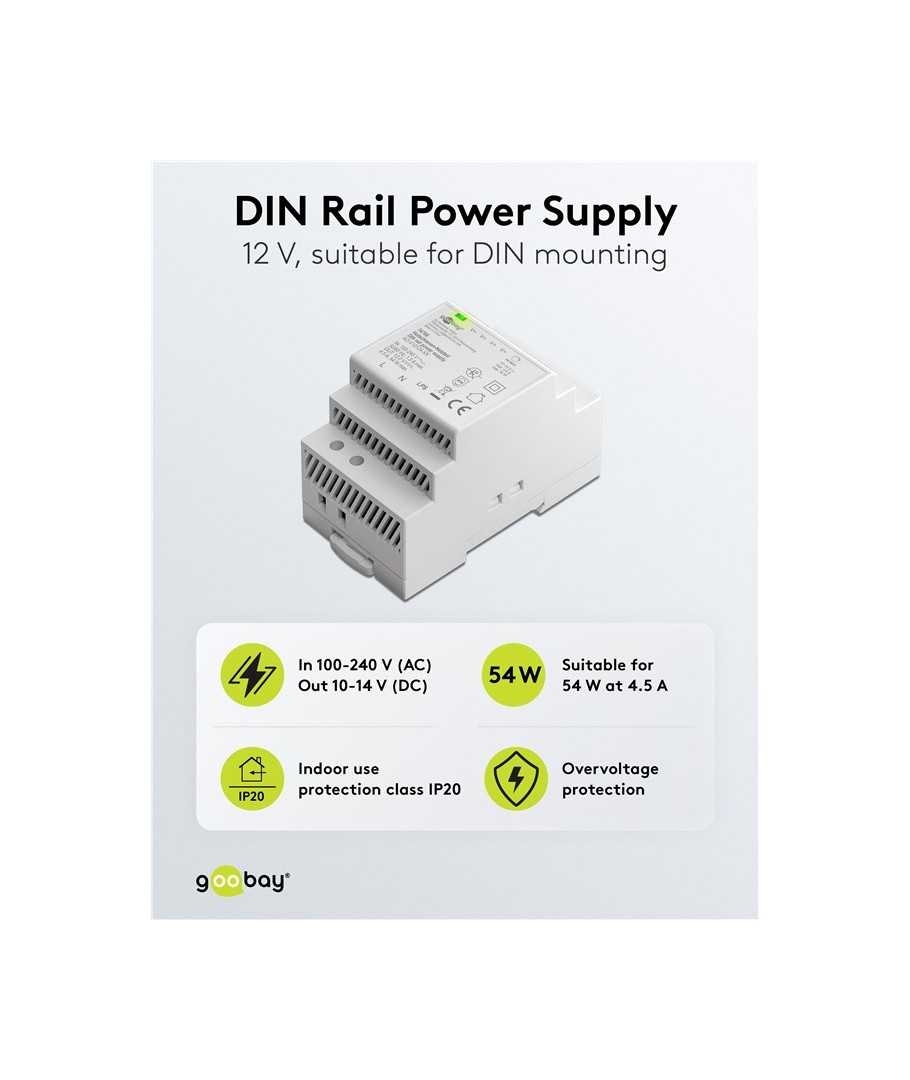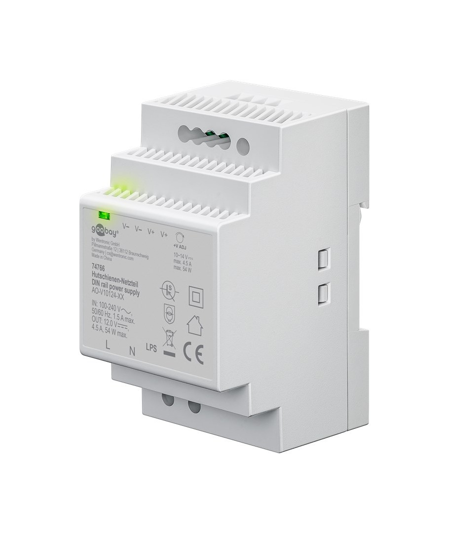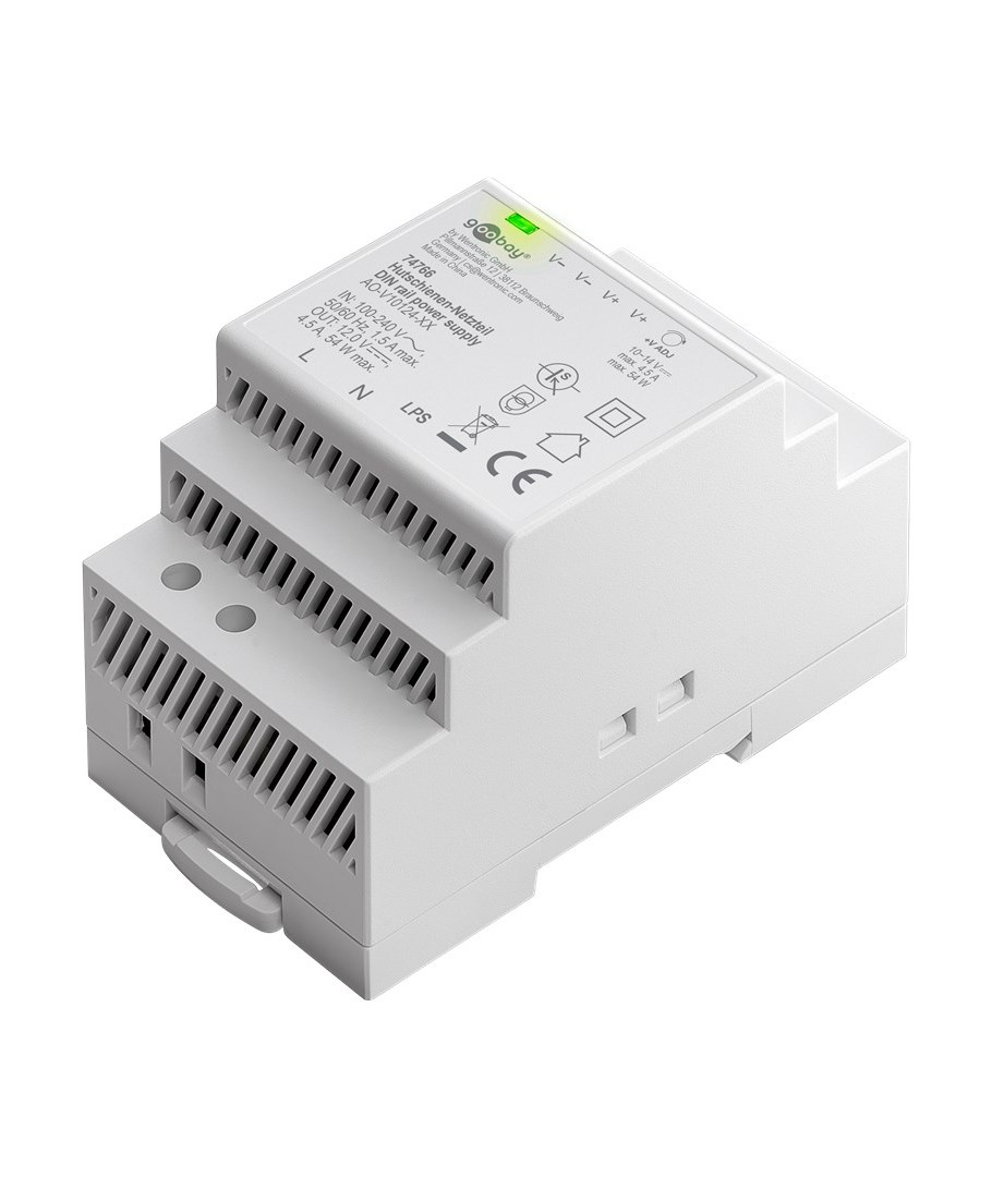 12V DC 4,5A strømforsyning til DIN skinne montering.