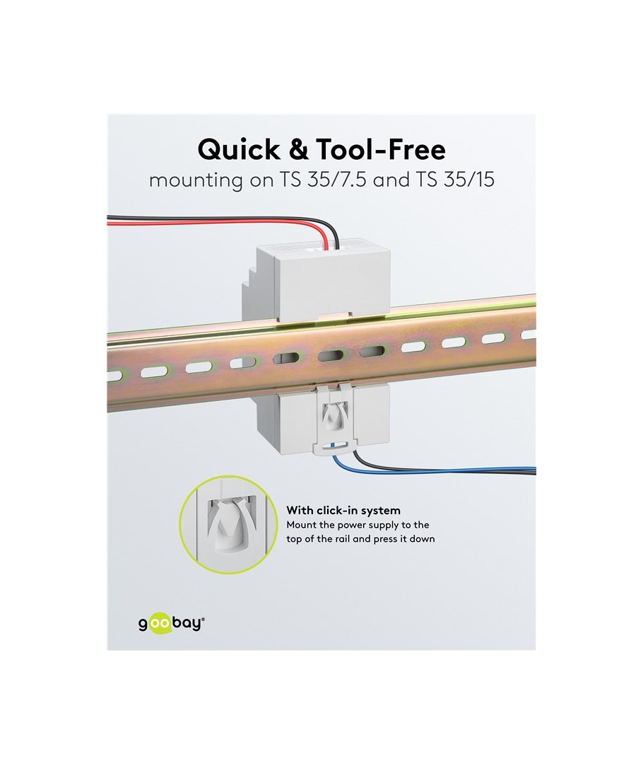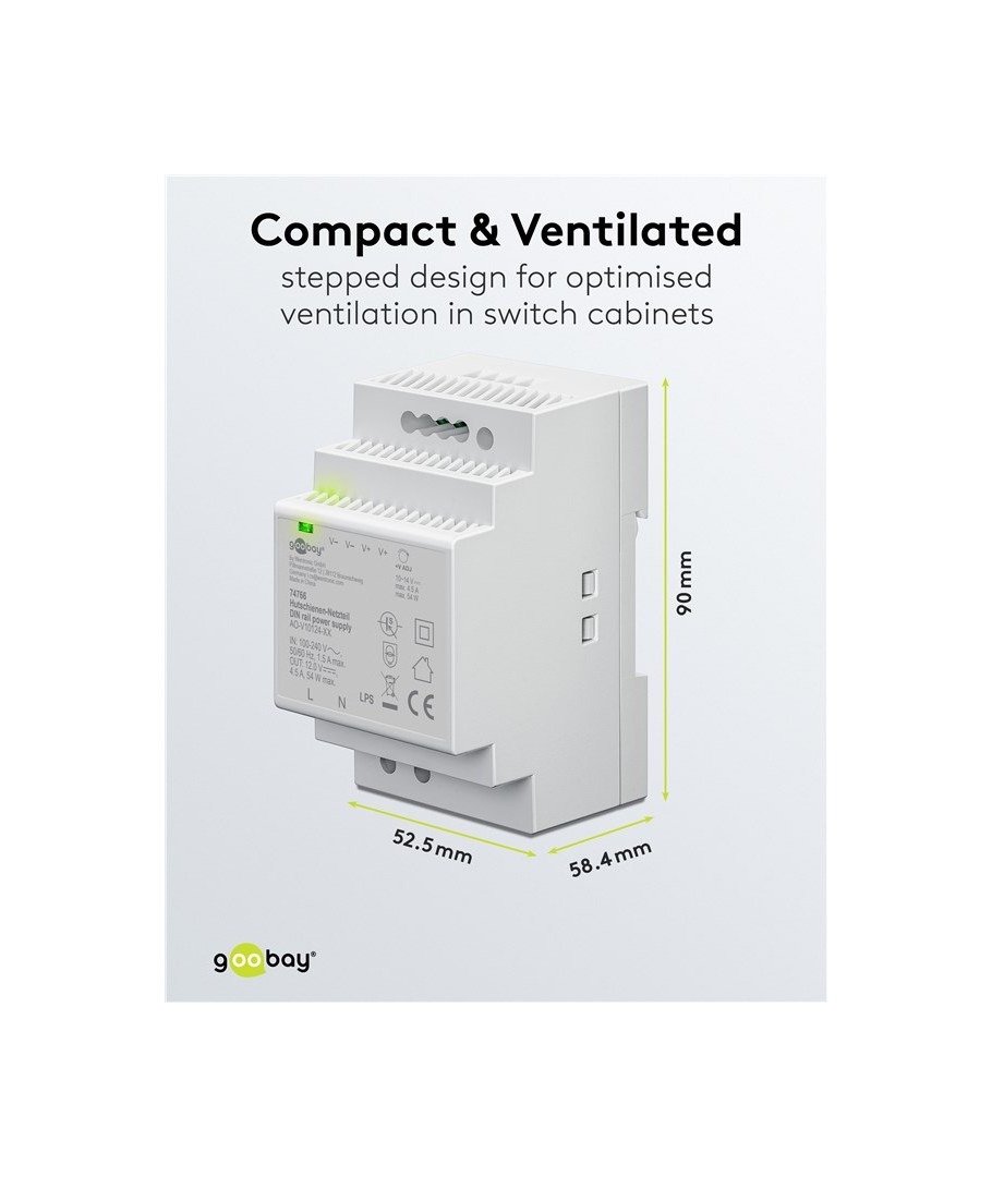 Denne strømforsyning er bygget til nem installation på en DIN skinne. Med dens kompakte dimensioner på 52,5 x 90 x 58,4 mm, passer den ubesværet ind i de fleste elektriske paneler. Dette gør det muligt at spare plads uden at gå på kompromis med ydeevne eller pålidelighed.