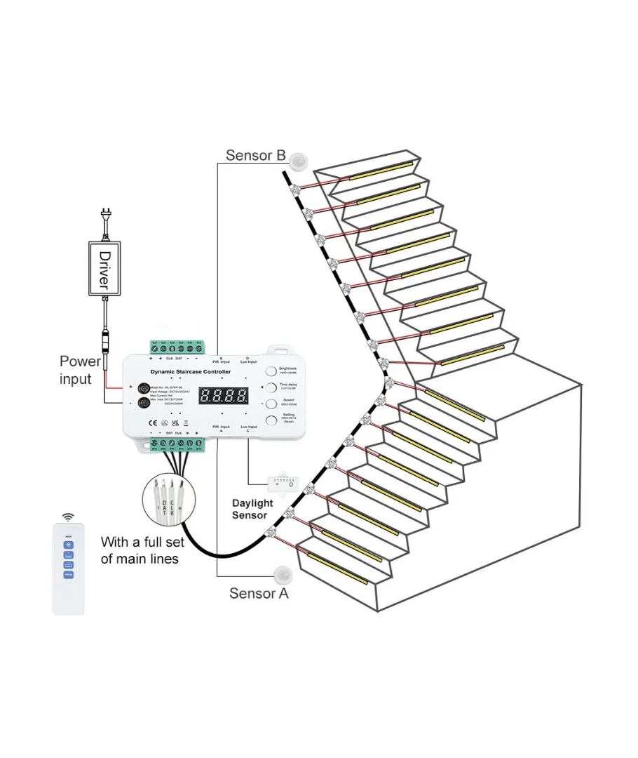 Herefter kan lyset på hvert trin styres separat af styringen.