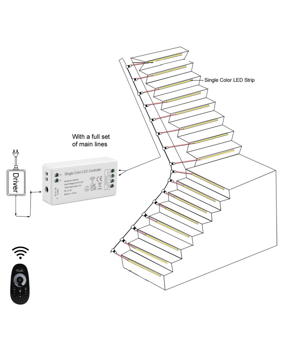 Nem montering, hvor der køres en "master" ledning i den ene side af trappen, hvor lyset til hvert trin nemt kobles på.
