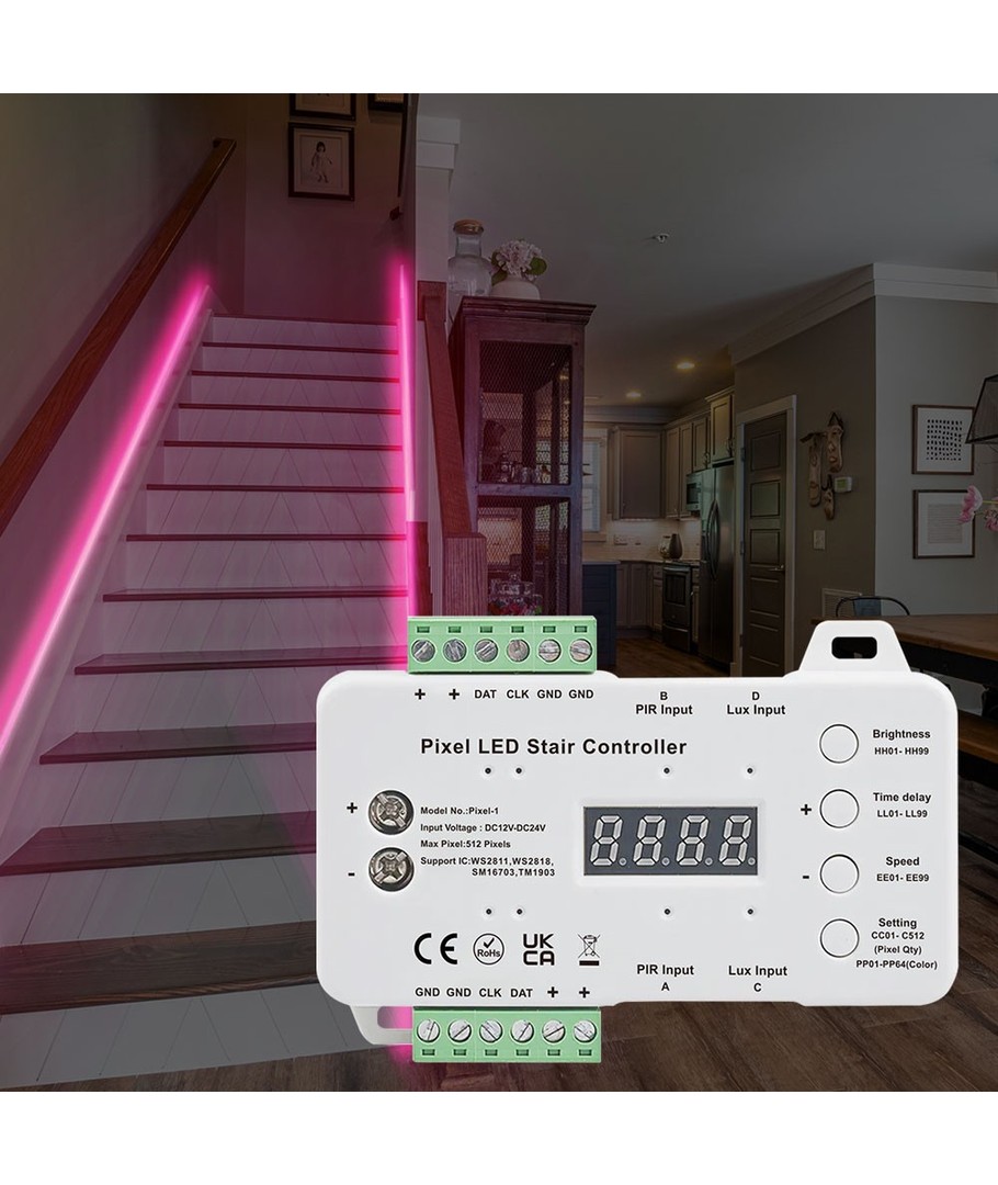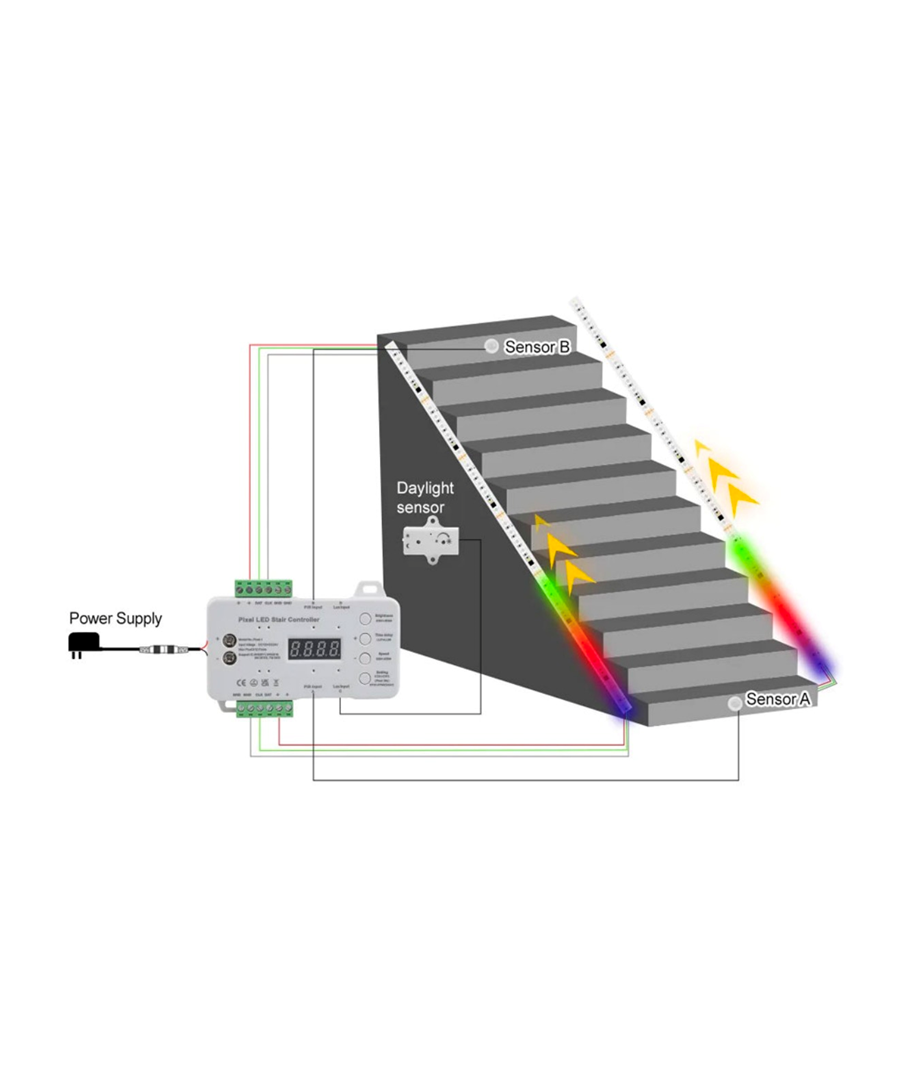 Dette intelligente styringscenter giver dig fuld kontrol over din trappebelysning. Tilpas belysningsmønstre og lysstyrke med lethed med den medfølgende sensor.
