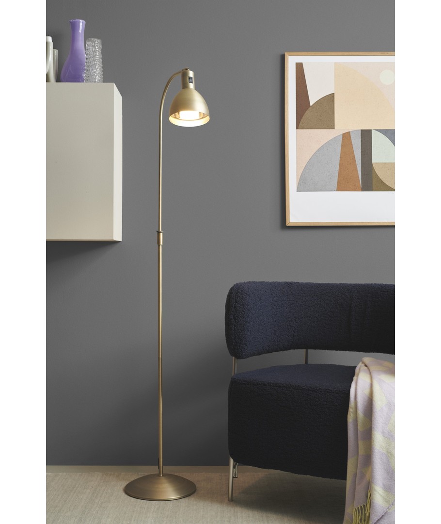 Uanset hvor du vælger at placere denne gulvlampe, vil dens varme messingtoner og enkle linjer med garanti bringe elegance og hygge til din stue, dit kontor eller dit soveværelse.