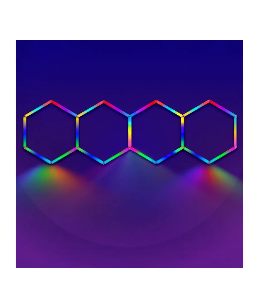 Med Hexagon RGBIC 4 felt komplet sæt får du en alt-i-en belysningsløsning, der kombinerer teknologi og design for at skabe den perfekte atmosfære i ethvert rum.