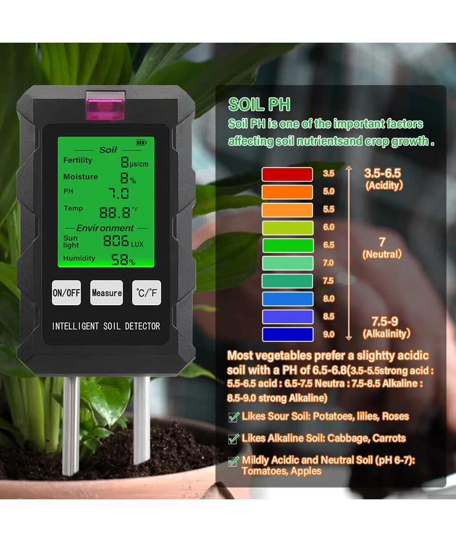 Oplev præcision og alsidighed med vores 6 i 1 måler, der forenkler plejen af dine planter ved at måle pH, fugt, temperatur, lysintensitet , næringsindholdet i jorden samt luftfugtighed i én kompakt enhed.