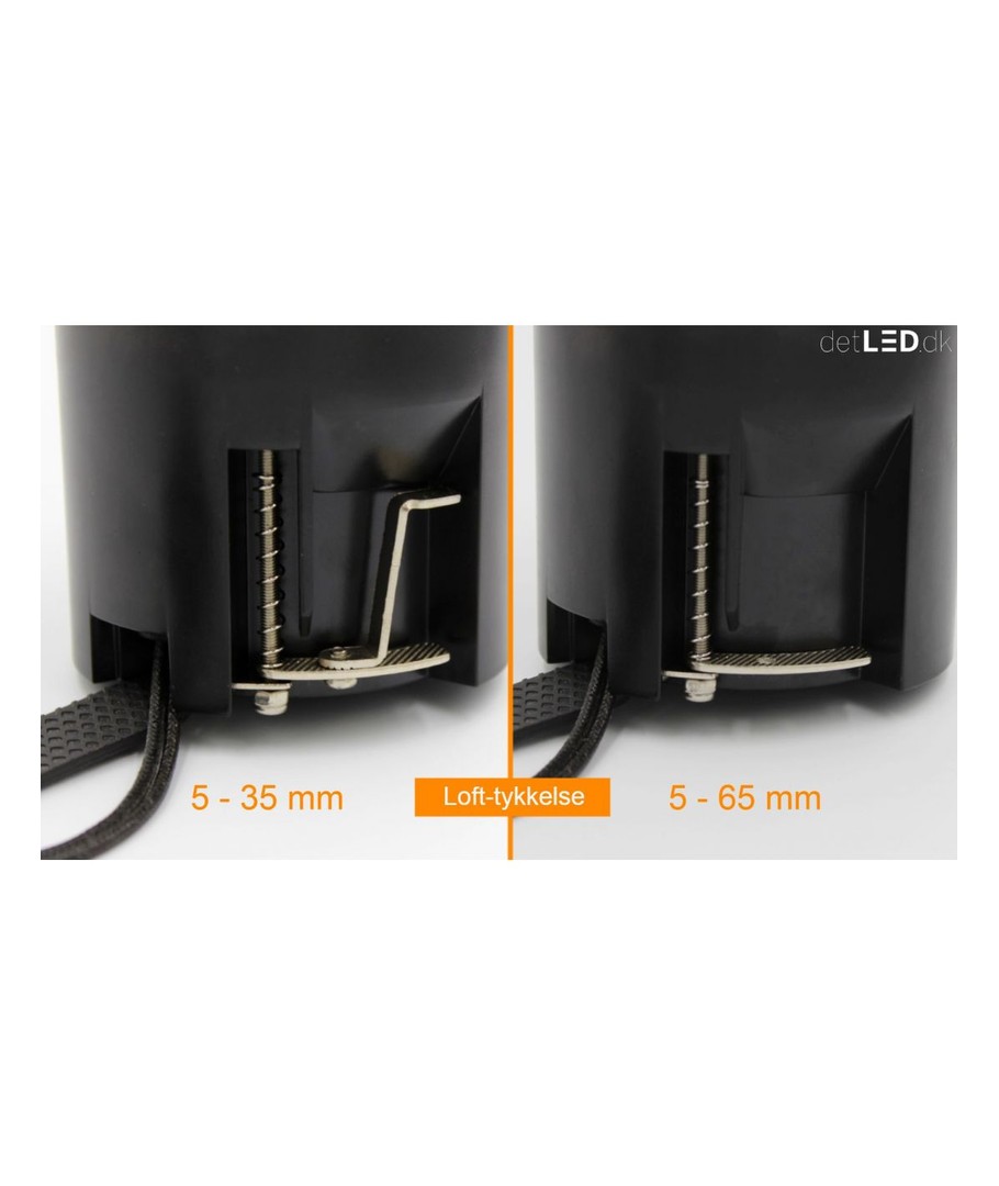 Kan indstilles til forskellige loft-tykkelser. Den passer normalt til 5-35mm, men kan ændres til så den passer i 5-65mm, som kan man se på billederne.