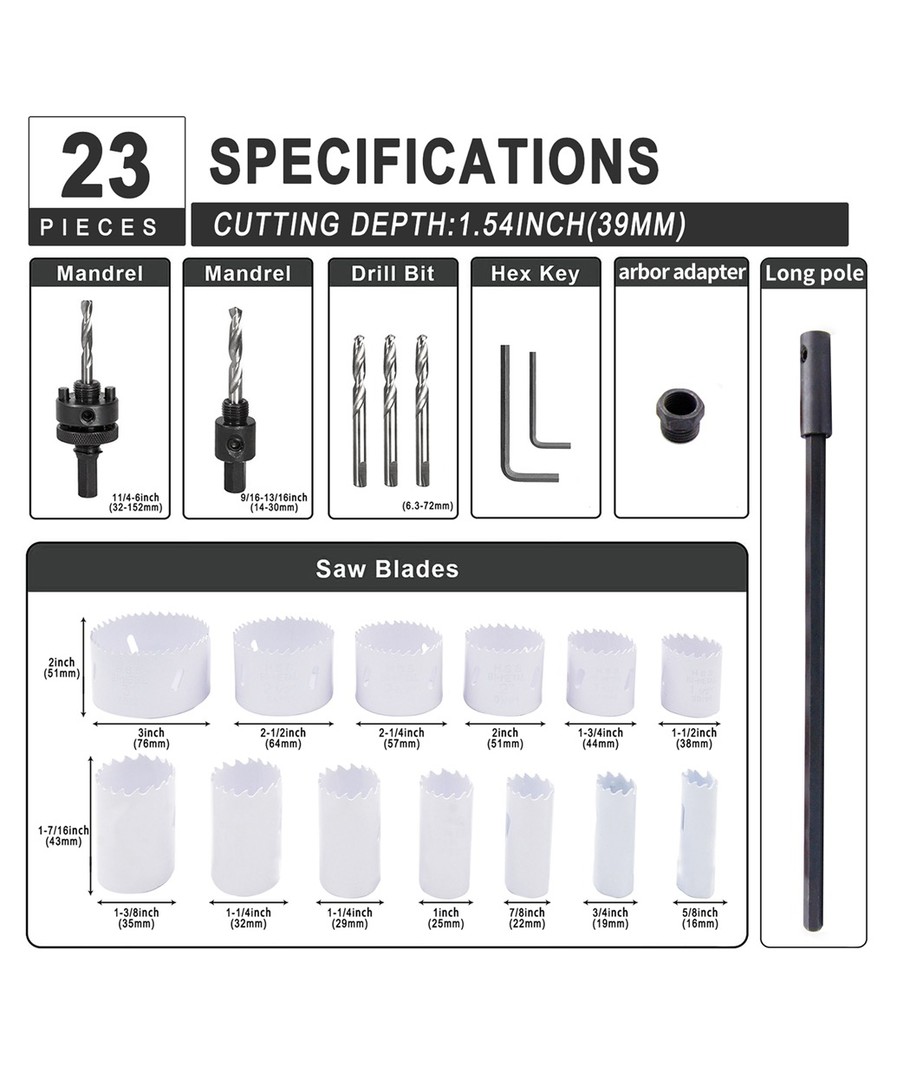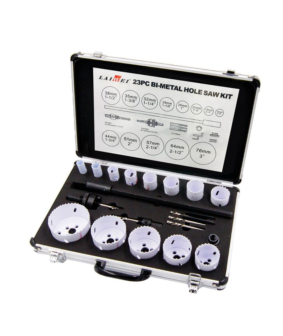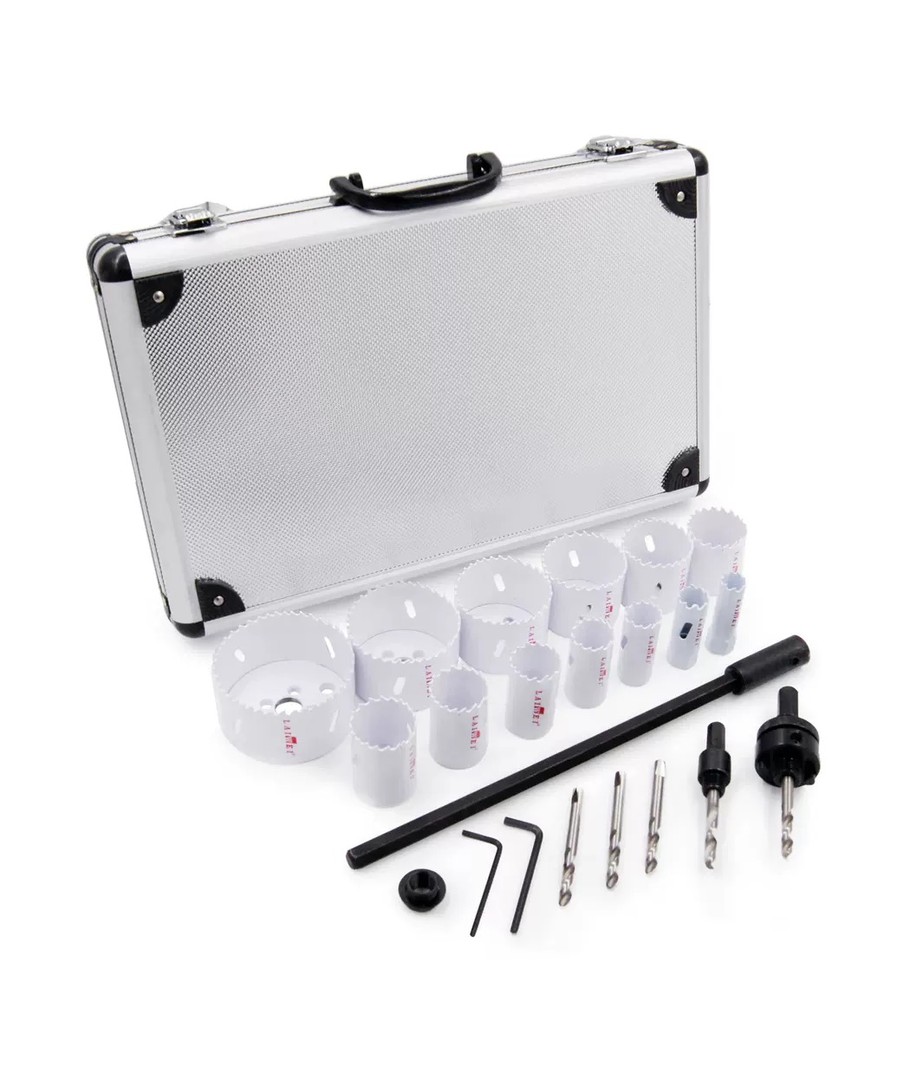 Komplet sæt med alt hvad du skal bruge for at bore huller i diverse træ- og loftsplader til montering af spots, ledninger mm.
