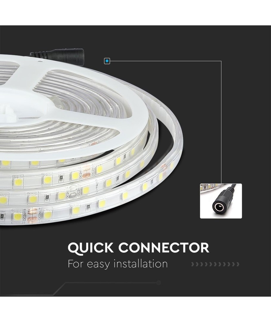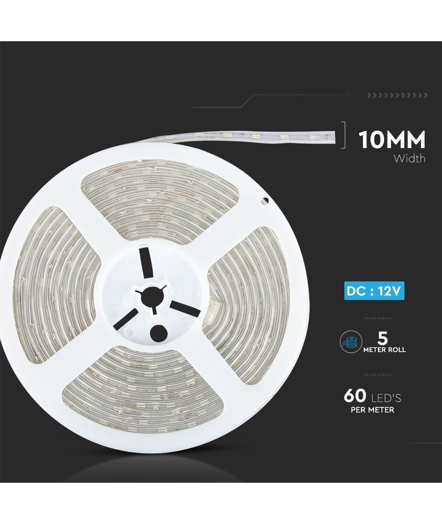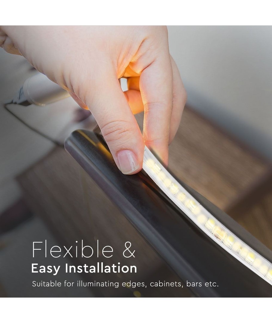 Med en bredde på kun 10 mm er denne LED strip kompakt og let at installere på trange steder. IP65-klassificeringen betyder, at den er stænktæt og kan modstå både vandstænk og regn, hvilket gør den perfekt til udendørs installationer som terrasser eller haver.