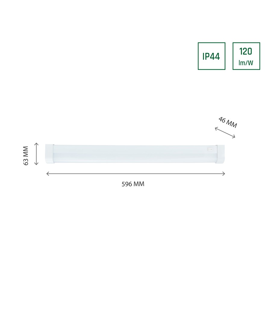 Med dimensionerne 596 x 46 x 63 mm passer dette armatur perfekt ind i mange rum. Takket være dens IP44 klassificering er armaturet modstandsdygtigt over for fugtig luft og vandstænk på fronten, hvilket gør det ideelt til badeværelsesmiljøer. Det integrerede lyskilde-design sikrer nem installation og vedligeholdelse.