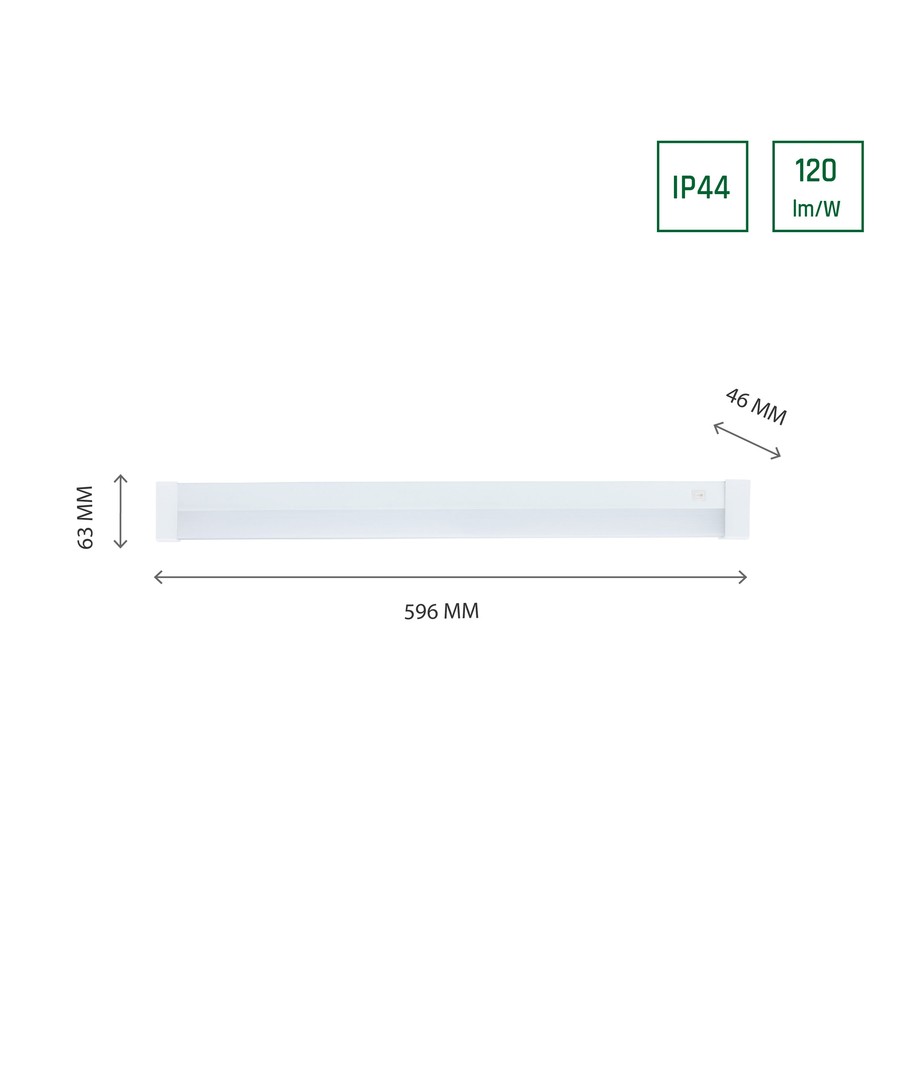Med sine dimensioner på 596 x 63 x 46 mm er armaturet kompakt, men alligevel effektivt. Certificeringen IP44 betyder, at det tåler fugtig luft og vandstænk på fronten, hvilket gør den velegnet til både badeværelse og køkken.