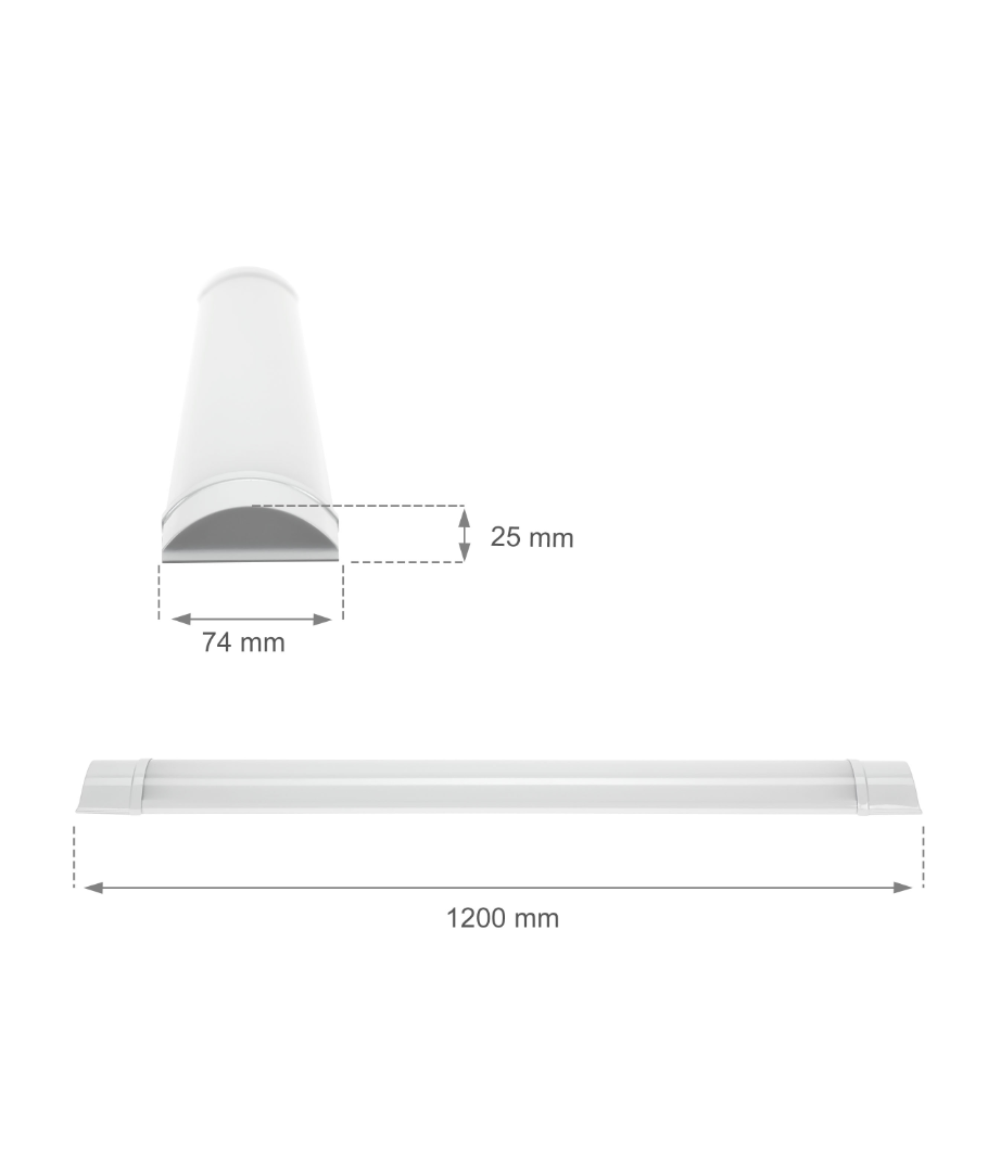 Armaturet har dimensionerne 74 x 25 x 1200 mm og er nemt at installere, da det tilsluttes direkte til en 230V forsyning. Det er udstyret med en integreret lyskilde, hvilket forenkler installationsprocessen yderligere.