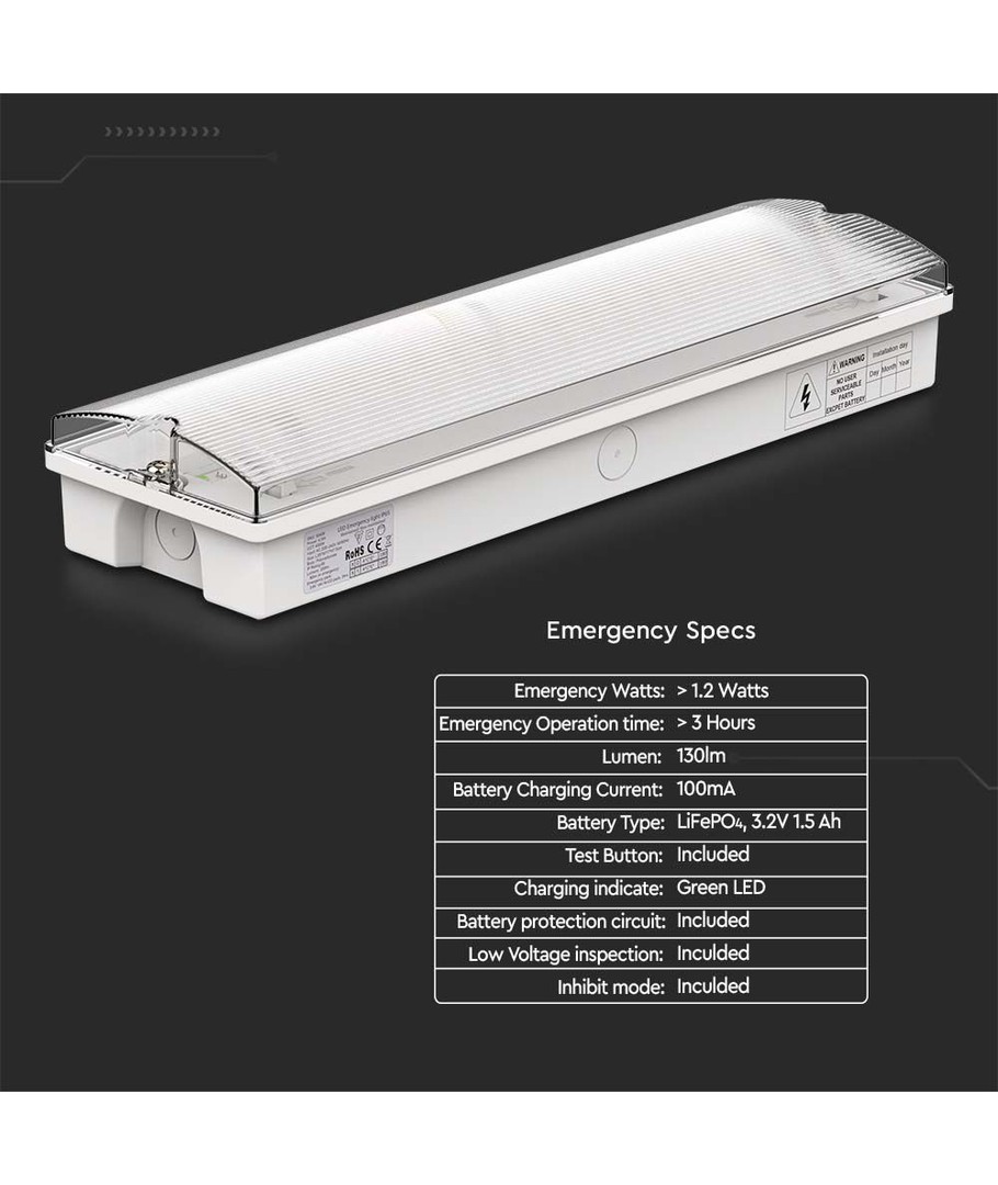 Produktet kommer med integreret lyskilde og inkluderer batteri og piktogrammer for enkel installation. Yderligere bekvemmelighed opnås ved selvtestknappen, der gør det nemt at sikre, at systemet fungerer perfekt.