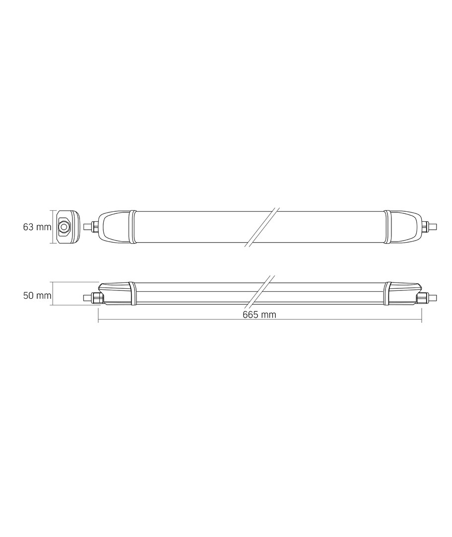Lampen har kompakte dimensioner på 63 x 665 x 50 mm, hvilket gør den nem at installere i forskellige miljøer. Desuden er den sammenkoblingsbar, hvilket betyder, at flere lamper kan kobles sammen for at opnå den ønskede belysning.