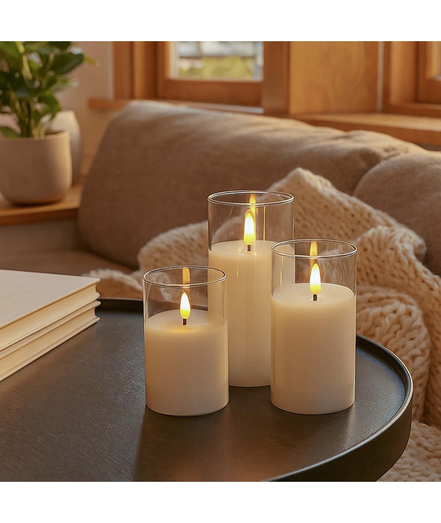 Oplev den varme og hyggelige atmosfære, som LED Bloklys sæt i glas bringer til dit hjem. Dette sæt af tre bloklys giver dig mulighed for at nyde den smukke flammeeffekt uden besværet med røg eller brandfare.