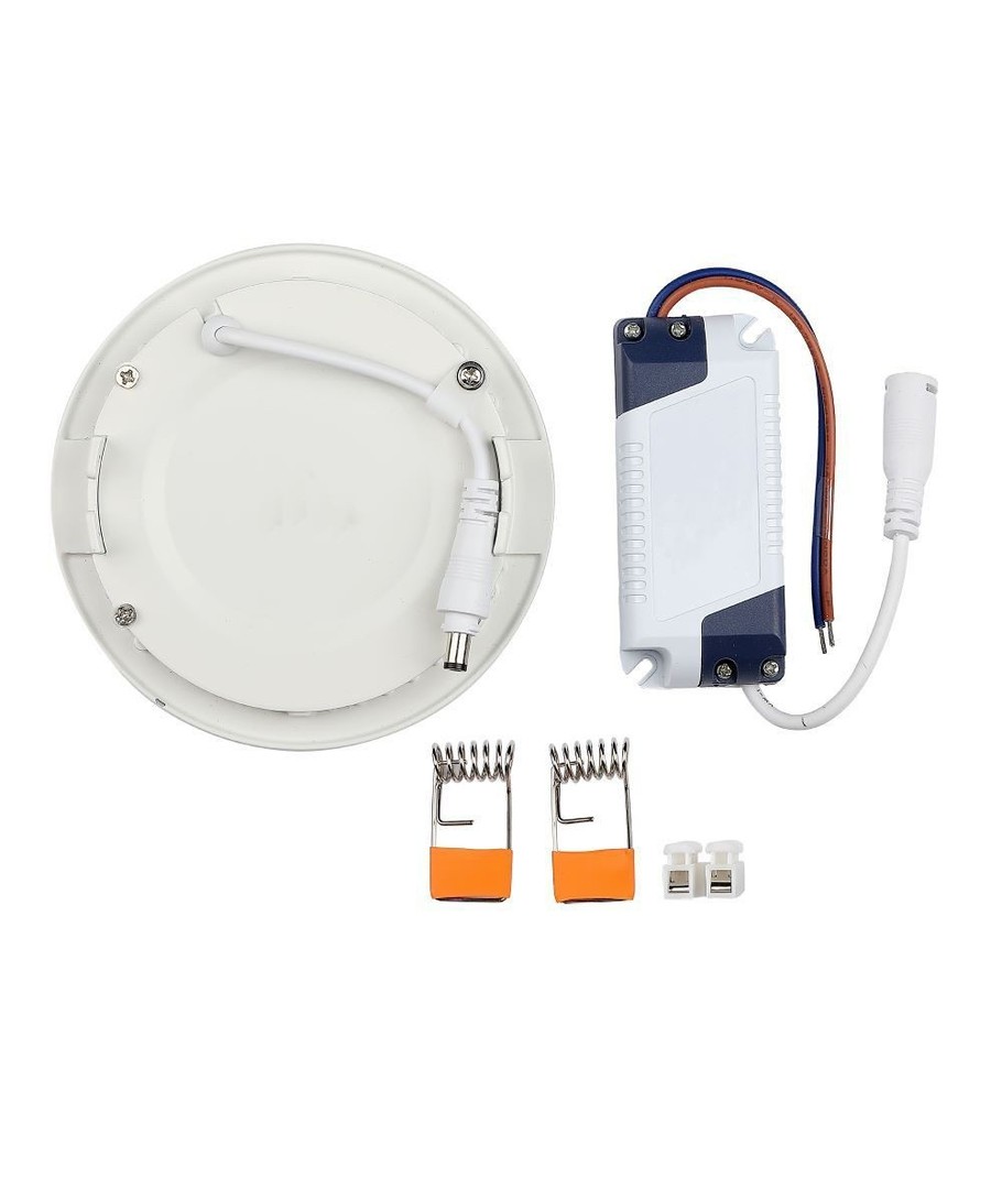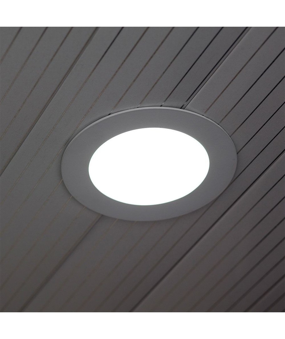 Panelet har dimensioner på 25 x Ø225 mm og kræver en hul størrelse på Ø210 mm for indbygning. Bemærk, at produktet har IP20 og derfor ikke er vandtæt. Den integrerede lyskilde sikrer lang holdbarhed.