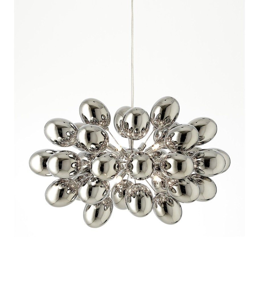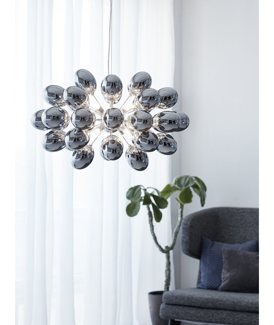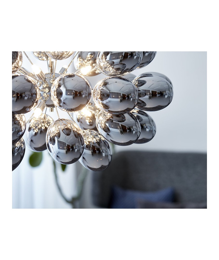 Elegant Pendel lampe med 32 flotte sølv galskugler fra Nielsen Light. Flot hen over spisebordet eller i et hjørne. lampen måler Ø: 74 cm. og en højde på 50 cm. (total højde med ledning 402 cm.) Lampen leveres med 8 stk. G9 fatninger.