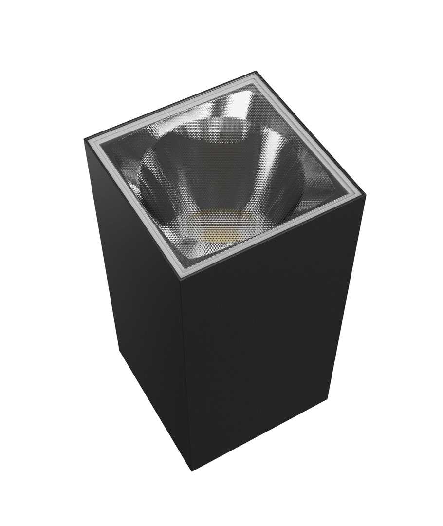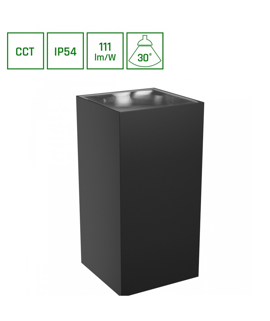 Lampens dimensioner på 78 x 162 x 99 mm giver den et kompakt og diskret udseende, der passer perfekt til moderne arkitektur. Den firkantede form giver en stilren æstetik, mens den sorte finish tilføjer et sofistikeret præg.