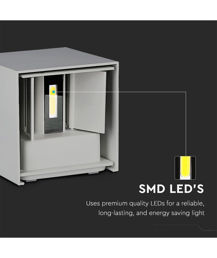Væglampens kompakte dimensioner på 100 x 100 x 100 mm gør den let at integrere i enhver udendørs indretning. IP65-certificeringen betyder, at lampen er designet til at modstå de fleste vejrbetingelser, fra regn til støv.
