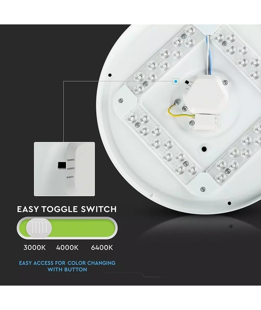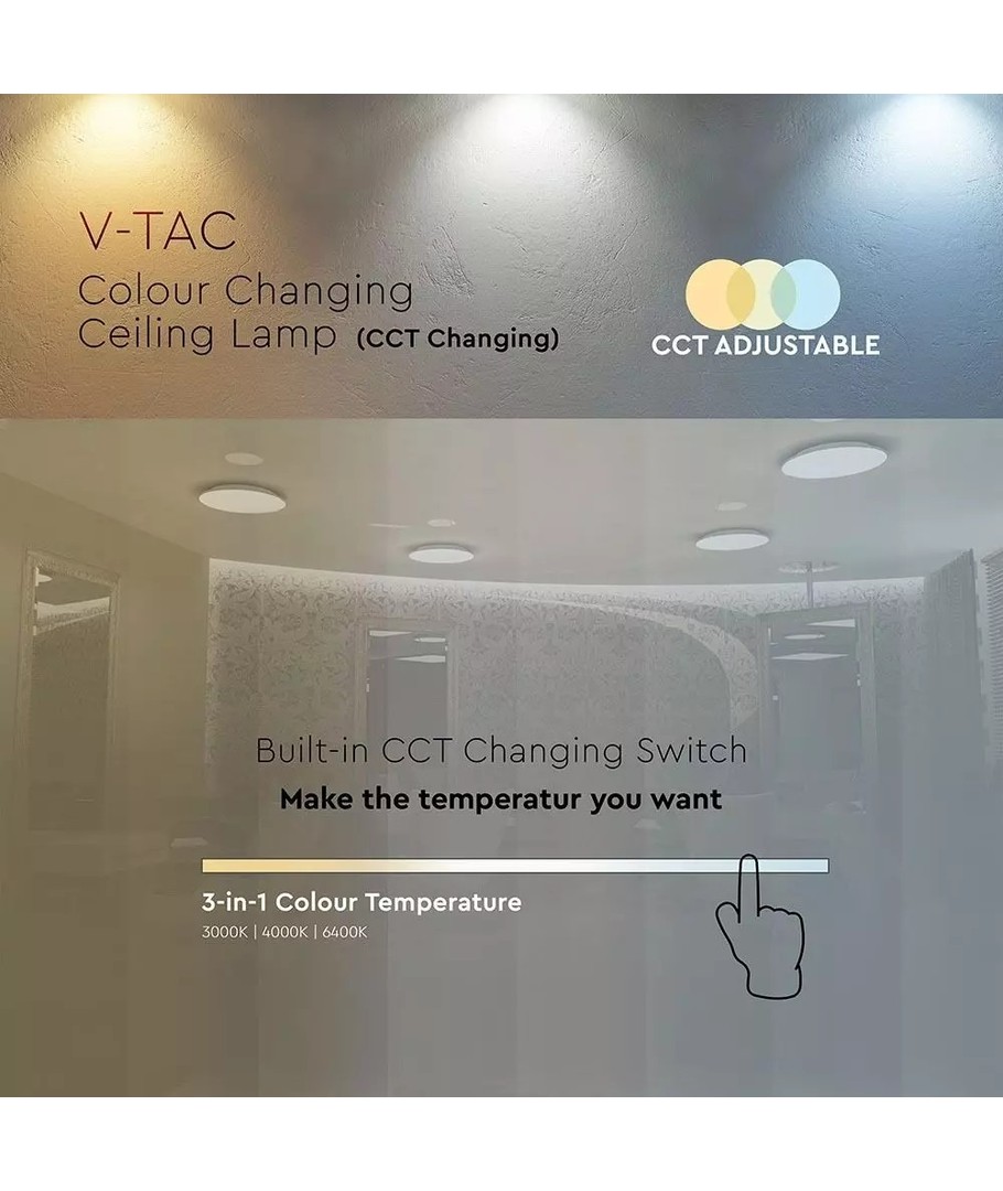 V-Tac loftslampen giver dig mulighed for at vælge mellem tre forskellige lyskulører, så du kan tilpasse belysningen til enhver stemning eller aktivitet. Uanset om du ønsker et varmt og hyggeligt lys til afslapning eller et koldt, energisk lys til effektivitetskrævende opgaver, kan denne lampe opfylde dine behov.