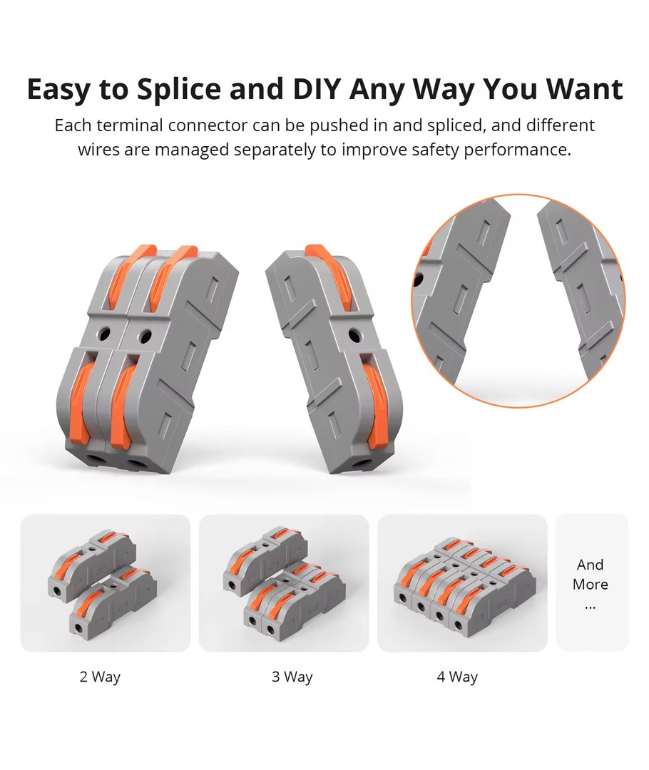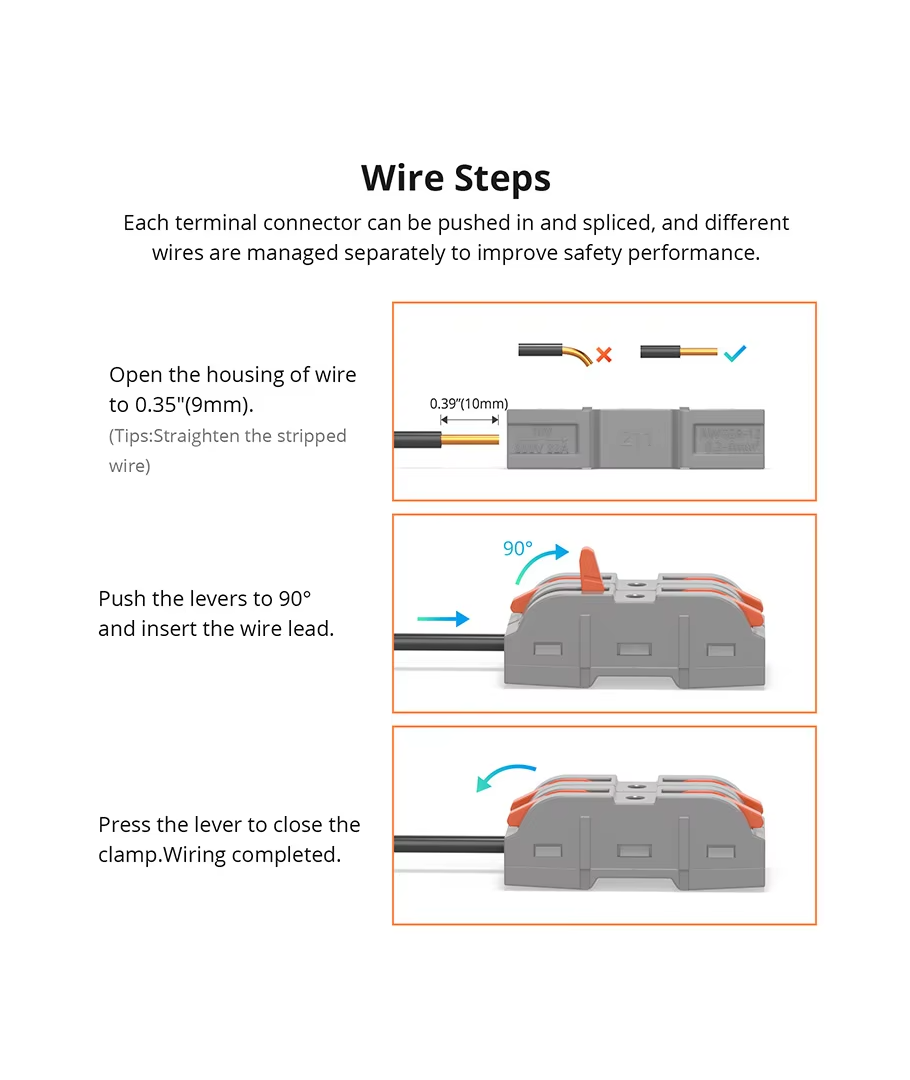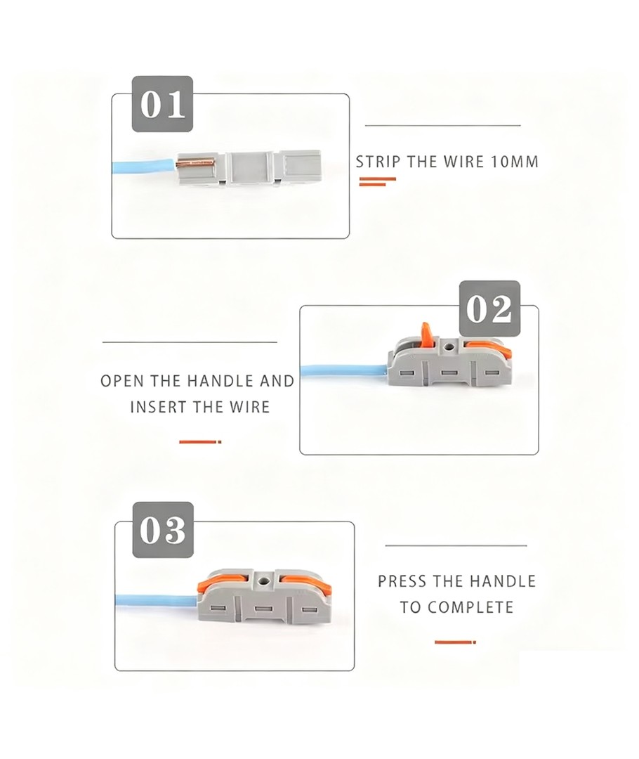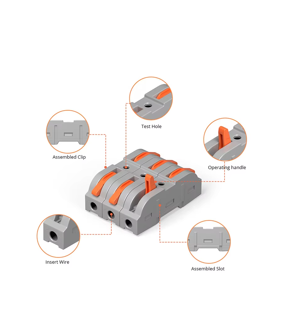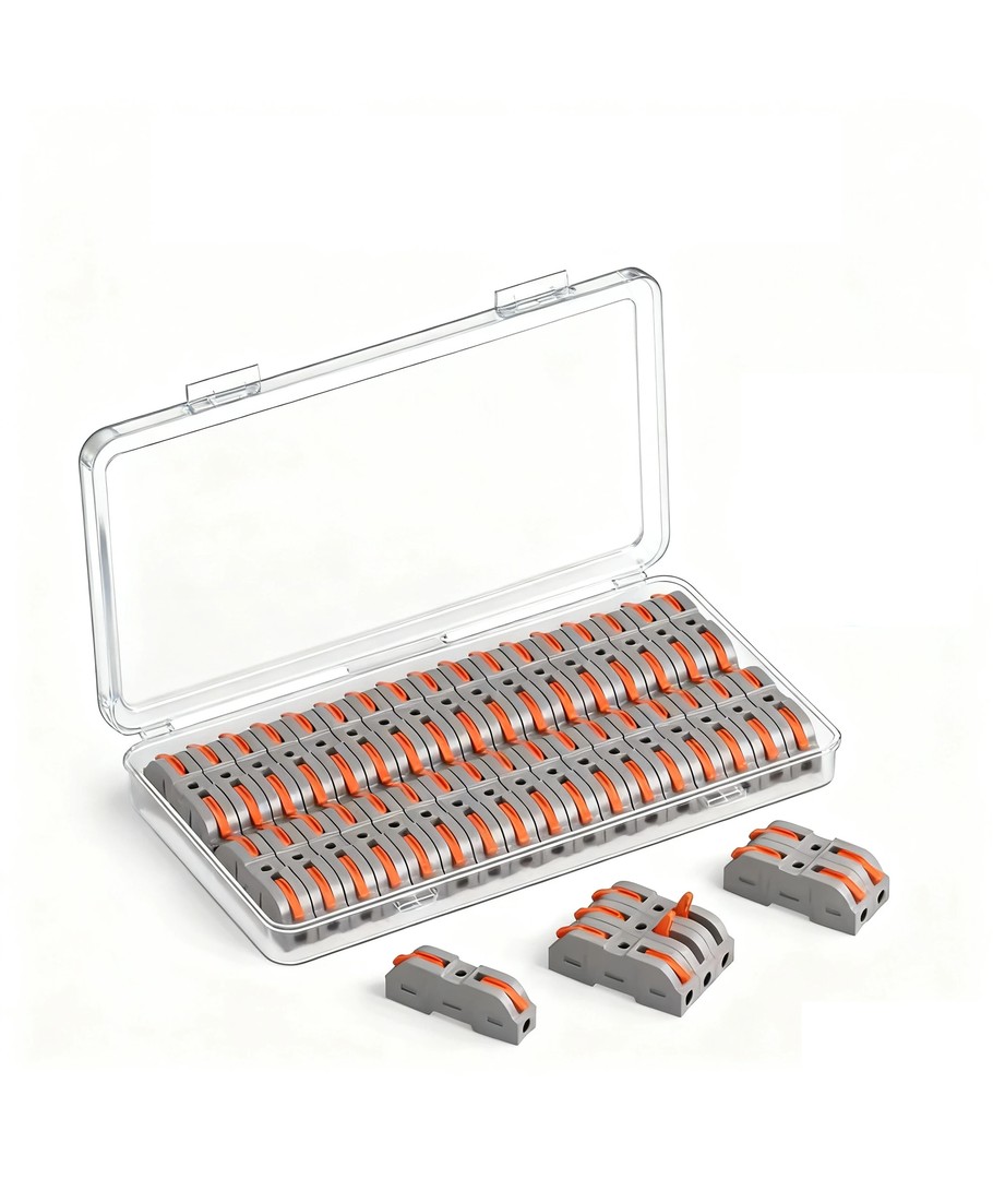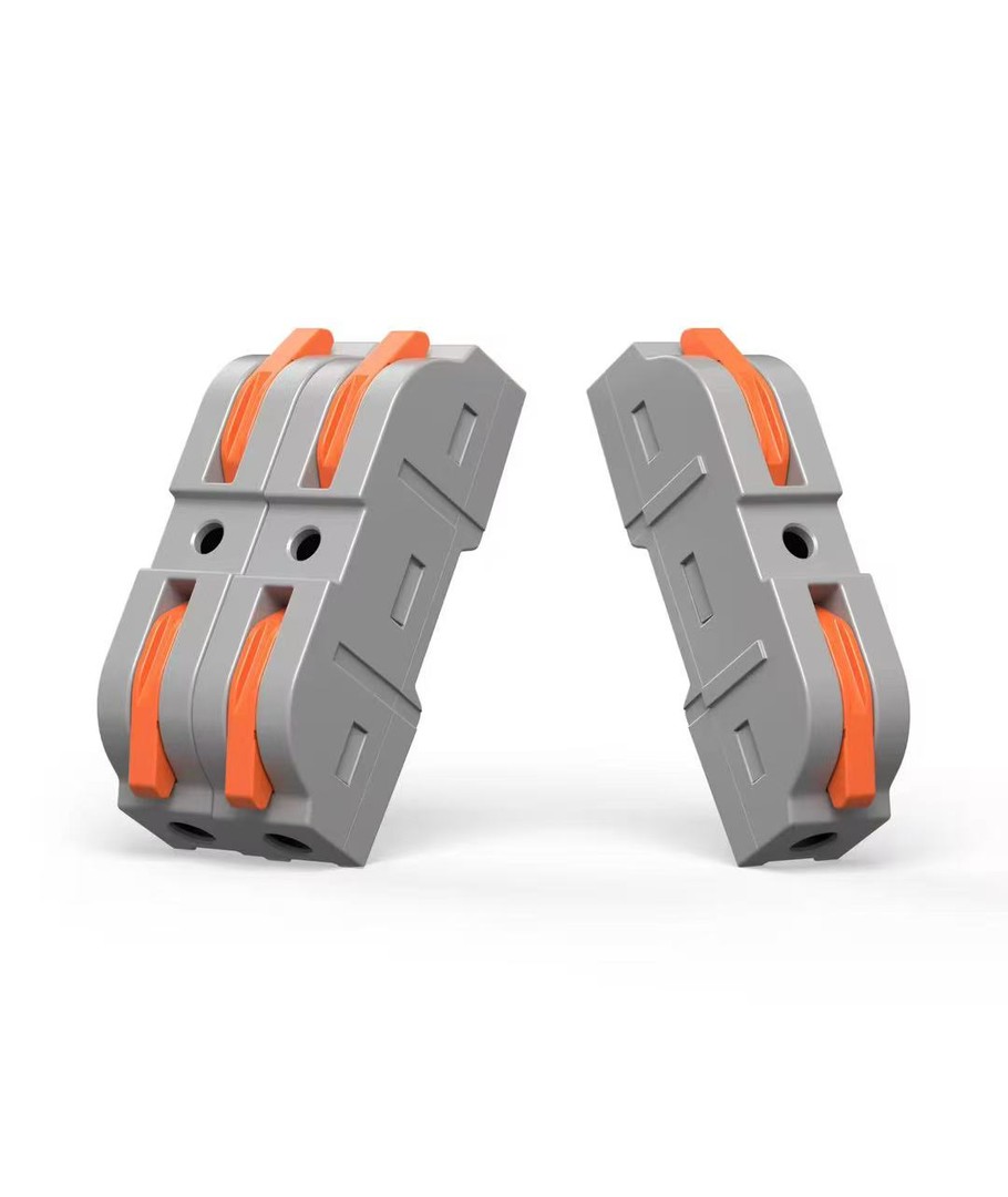 Skrueløse samlemuffer der kan bruges til både bløde og stive ledere på samme tid. De har et praktisk tilslutningssystem, med orange vippepal, som gør det nemt at få de bløde ledere ind i hullerne. Ledningerne samles 1 og 1.