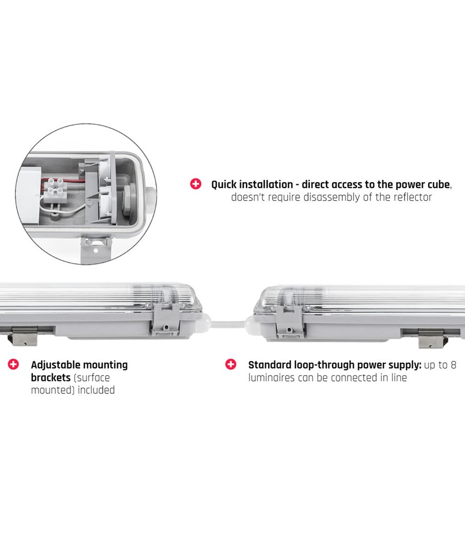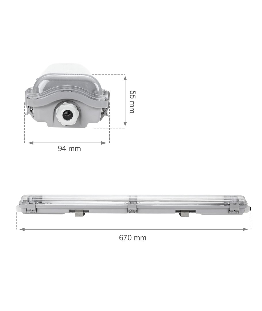 Limea T8 LED dobbeltarmatur har dimensionerne 710 x 63 x 90 mm og kommer med en beskyttende IP65 klassificering, hvilket gør det velegnet til udendørs brug, da det tåler både vandstænk og regn.