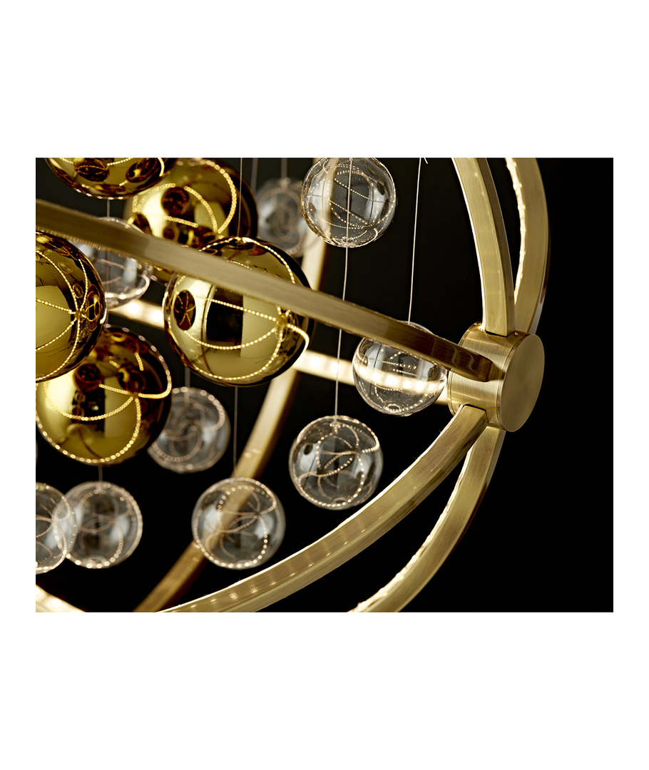 Lampen er monteret med LED Strips rundt langs lampen som gengiver lyset i glaskuglerne ud i rummet. Virkelig en spændende og utrolig flot lampe.