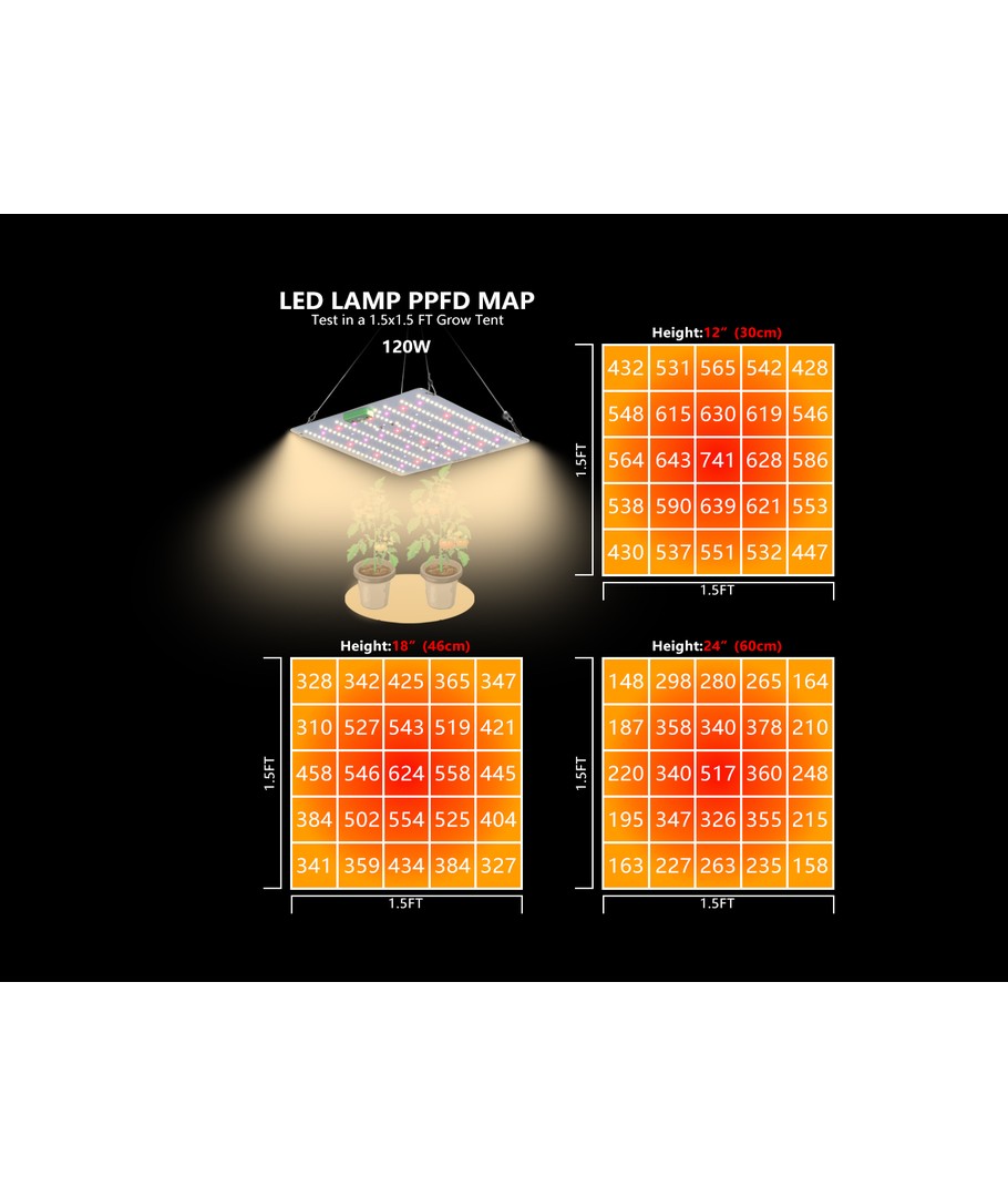 PAR (center værdi): | 620 ppfd 30cm 580 ppfd 45cm 410 ppfd 60cm |