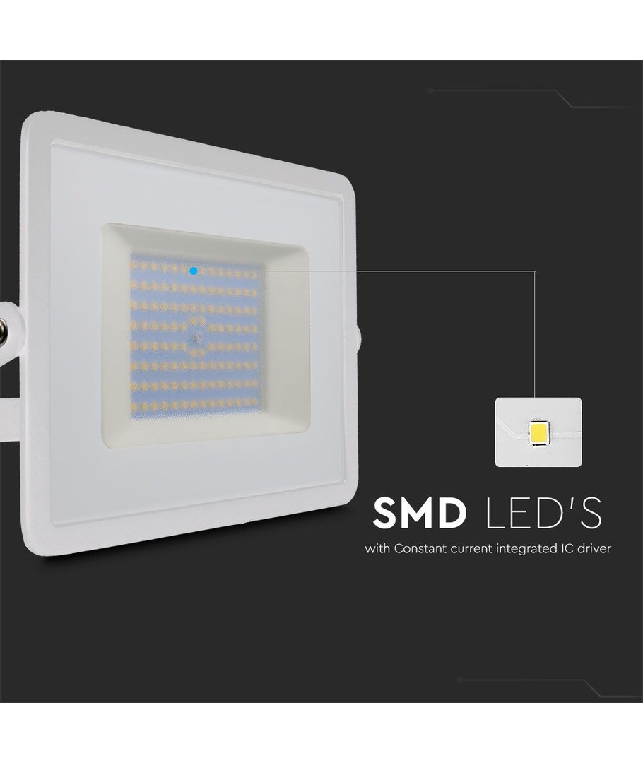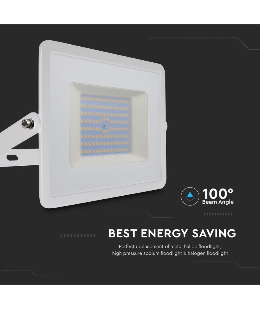 Projektøren kommer i en isende kold lysfarve på 6500K, som skaber et skarpt og klart lys med et charakteristisk blåligt skær. Denne type belysning er sjældent brugt i Skandinavien til almindelige formål, men er populær indenfor specifikke områder hvor klarhed og farvegengivelse er afgørende.