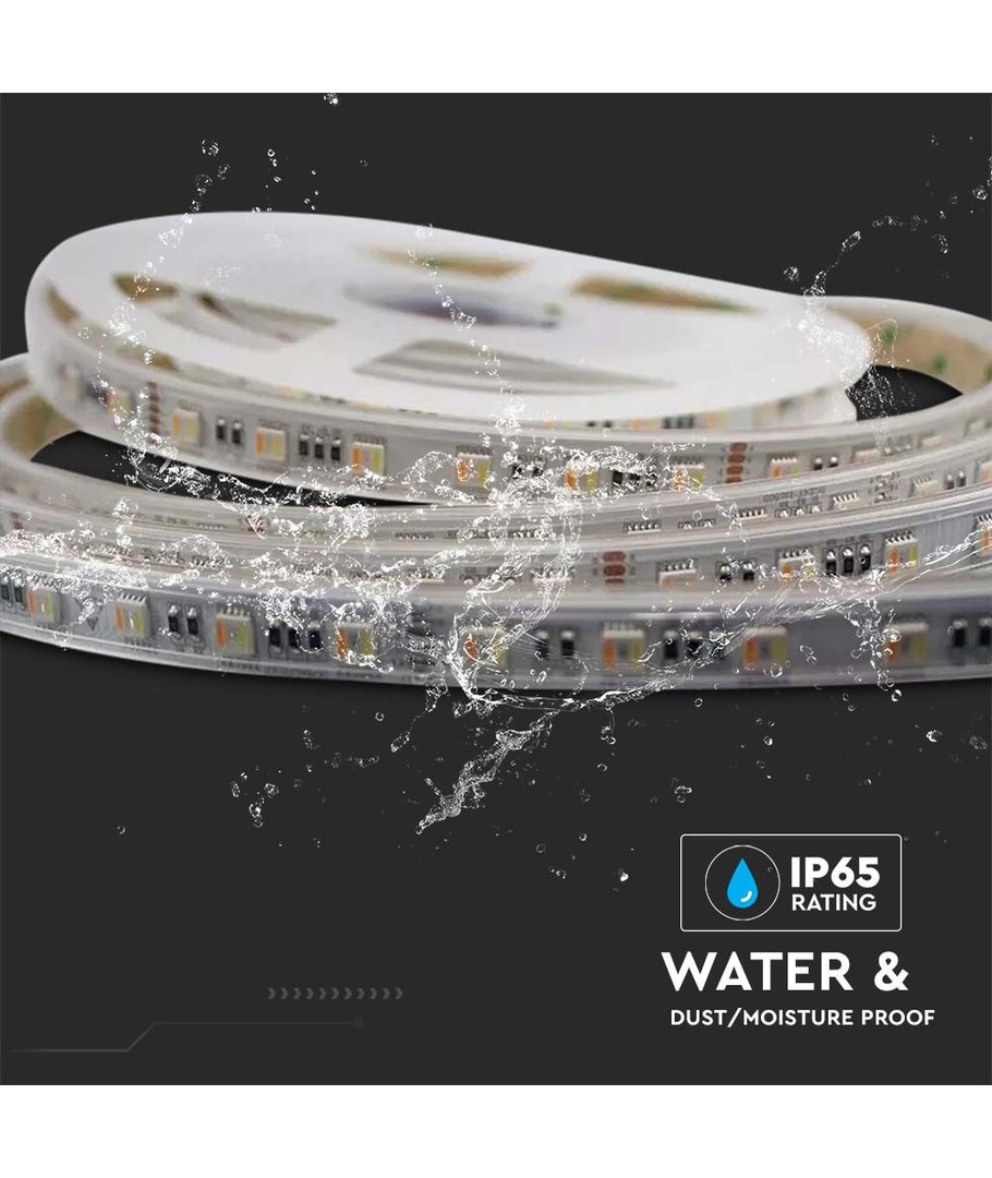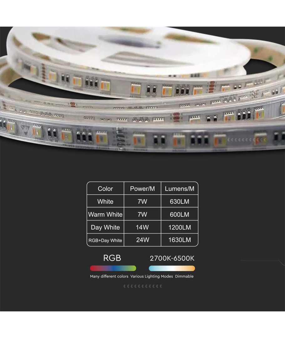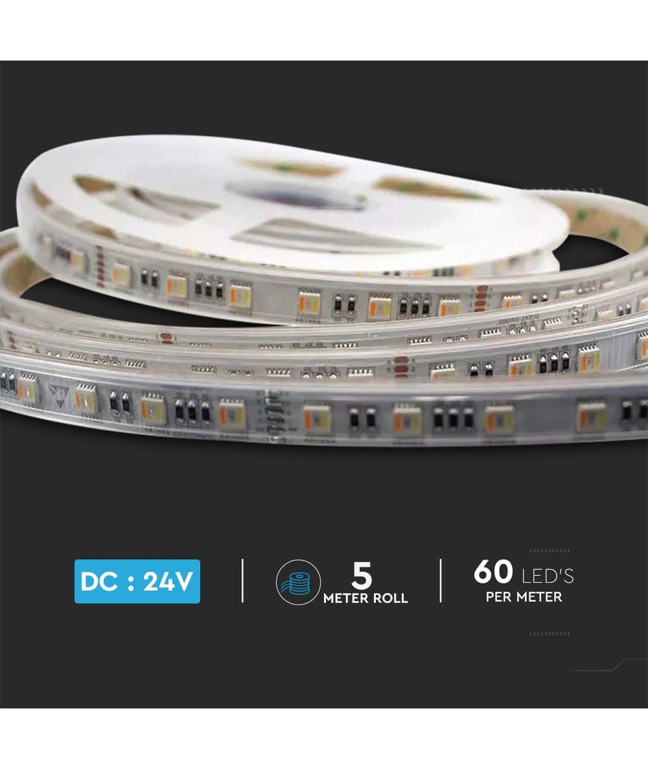 Den 5m RGB+CCT 24W/m LED strip tilbyder en alsidig og stemningsfuld belysningsløsning til både indendørs og udendørs brug.