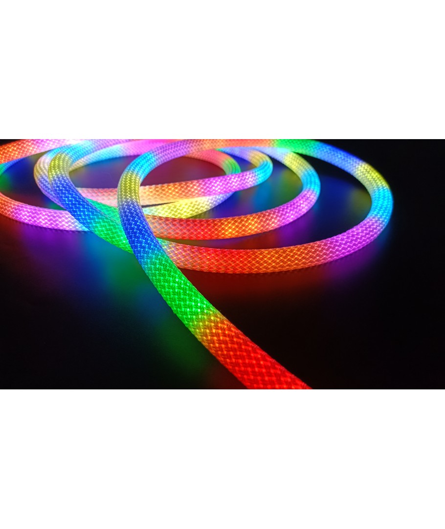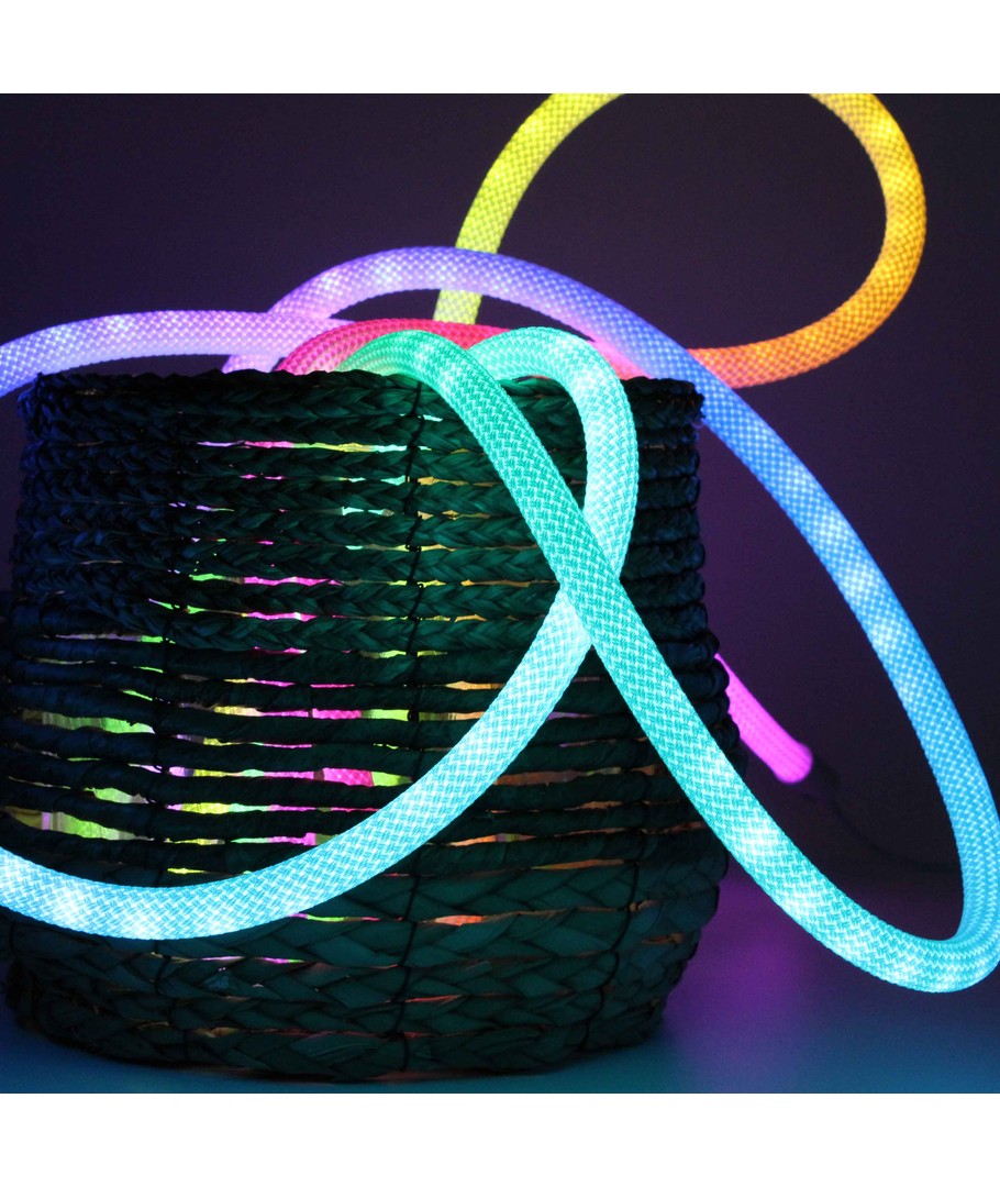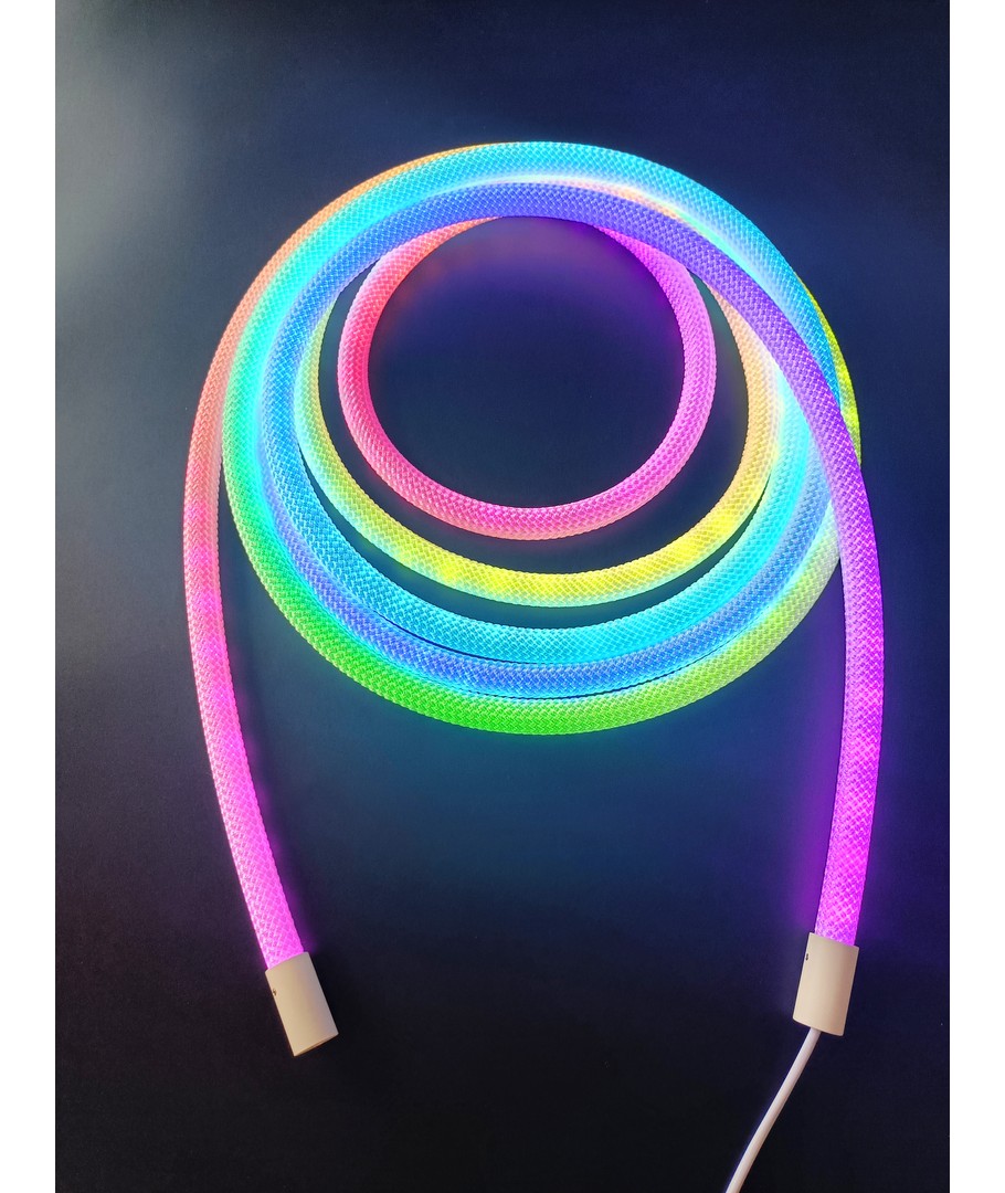 Oplev en verden af farver med vores 3W/m RGBIC Neon Flex strip med vævet reb - en 3 meter RGBIC neon flex, der bringer lys og liv til ethvert rum med sin dynamiske farvespil og fleksible design.