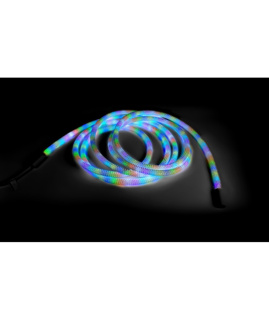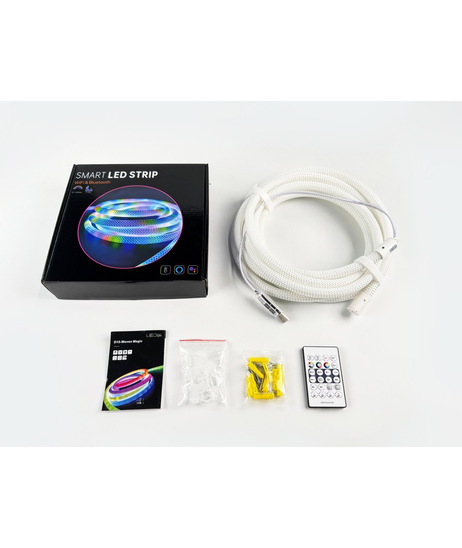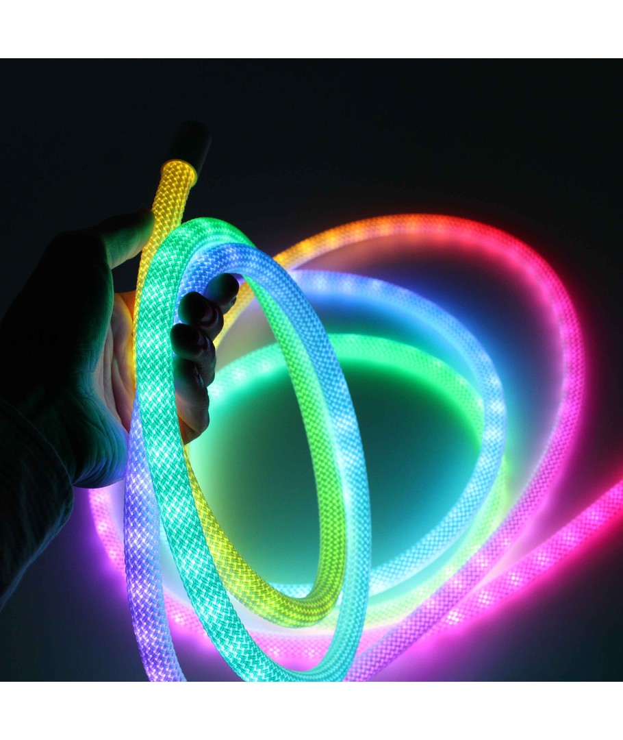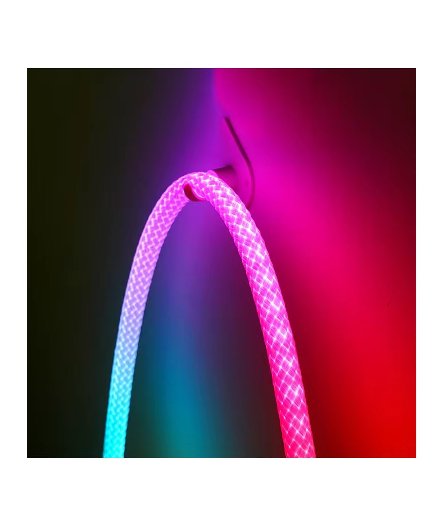 Oplev en verden af farver med vores 3W/m RGBIC Neon Flex strip med vævet reb - en 3 meter RGBIC neon flex, der bringer lys og liv til ethvert rum med sin dynamiske farvespil og fleksible design.