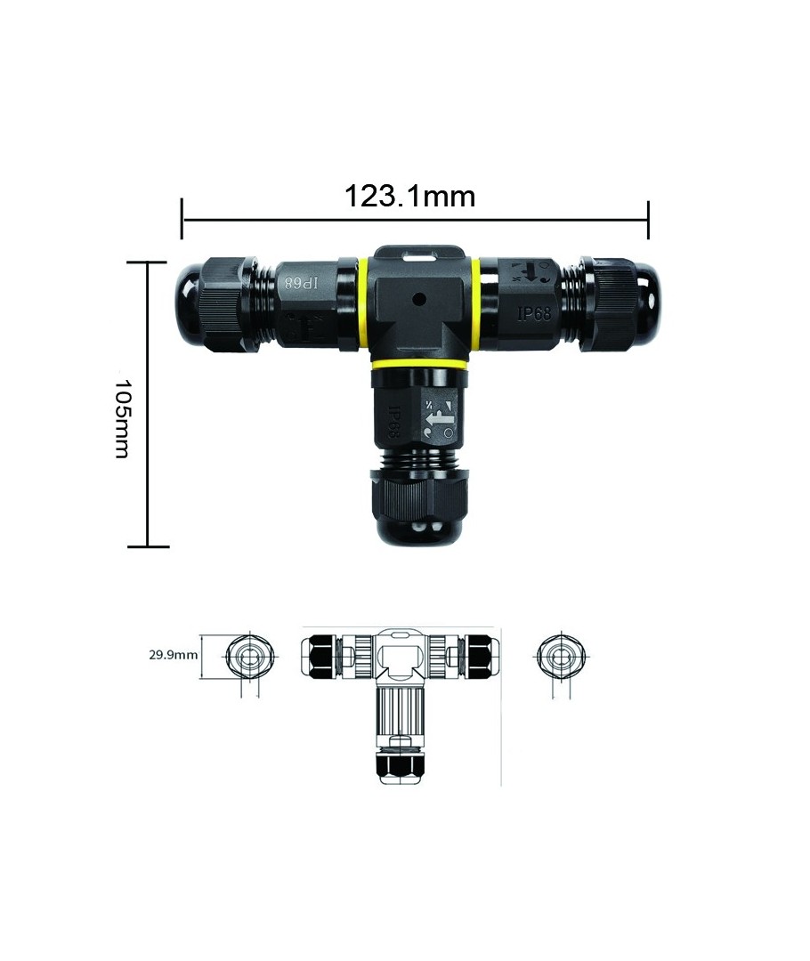Den kompakte konstruktion af T-samledåsen gør den nem at installere på begrænset plads. Med dimensioner på 76,5 x 123,1 x 24,6 mm er den designet til at passe ind selv i de mest udfordrende installationer, uden at gå på kompromis med effektiviteten eller udseendet.