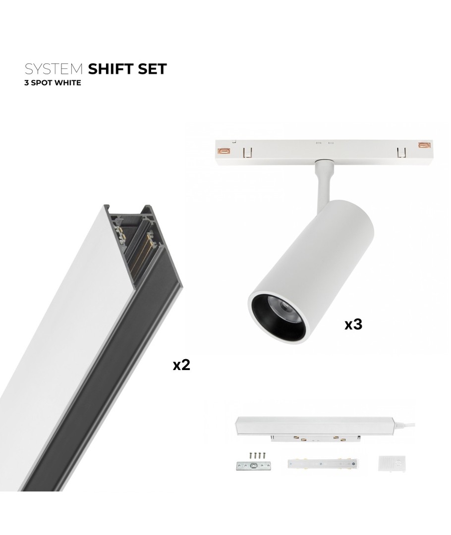 Med SHIFT 3x spot sættet, får du 2x 1 meters skinner og 3x LED spots, samt alt du skal bruge for at installere det.