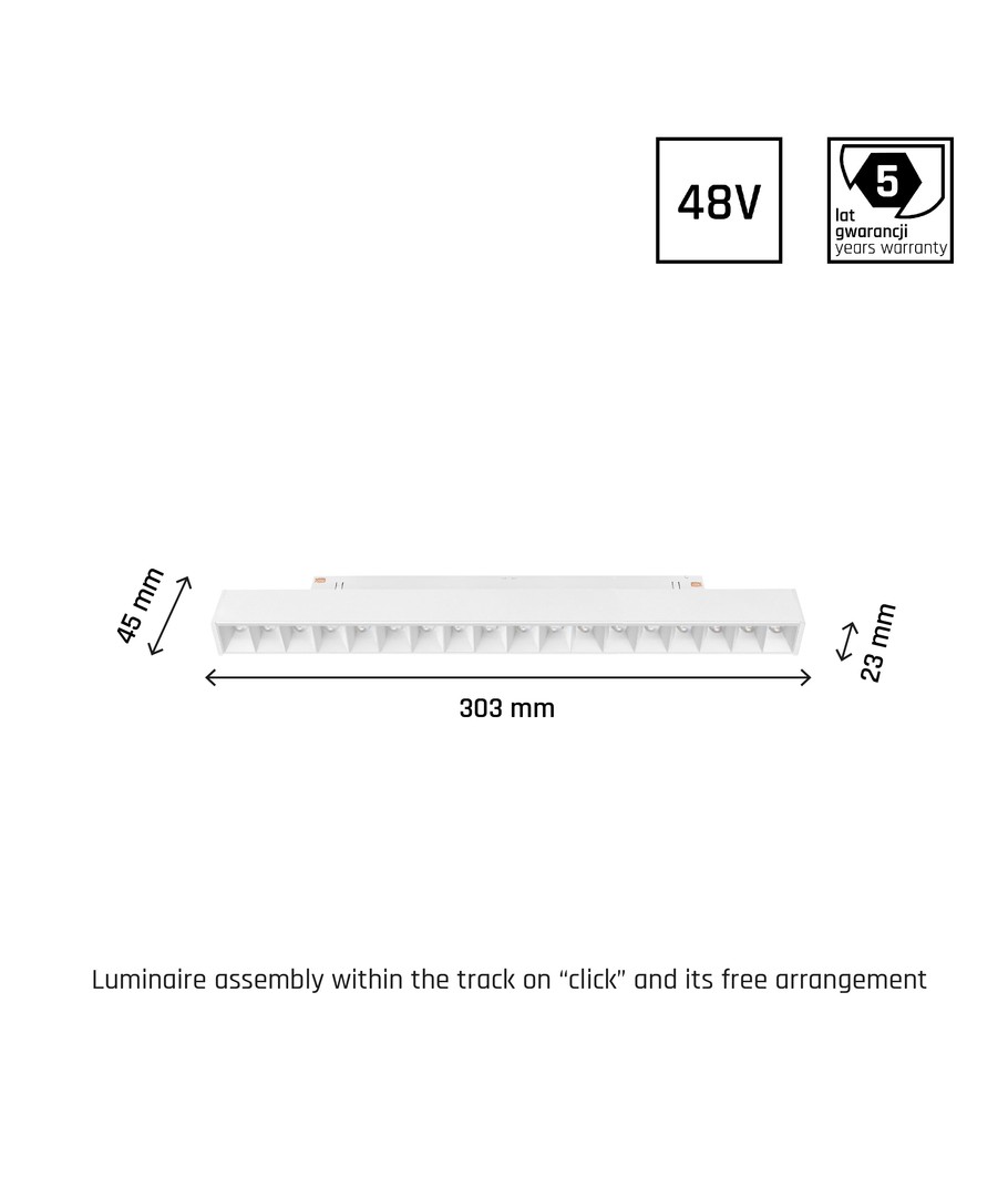 Oplev belysning af høj kvalitet med dette stilfulde skinnelys. Med en effekt på 17W og en tilslutning til 48V DC forsyning sikrer produktet både effektivitet og praktisk anvendelighed i ethvert miljø. Dette lys, med dimensionerne 303 x 23 x 42 mm, passer perfekt ind i moderne interiørdesign.