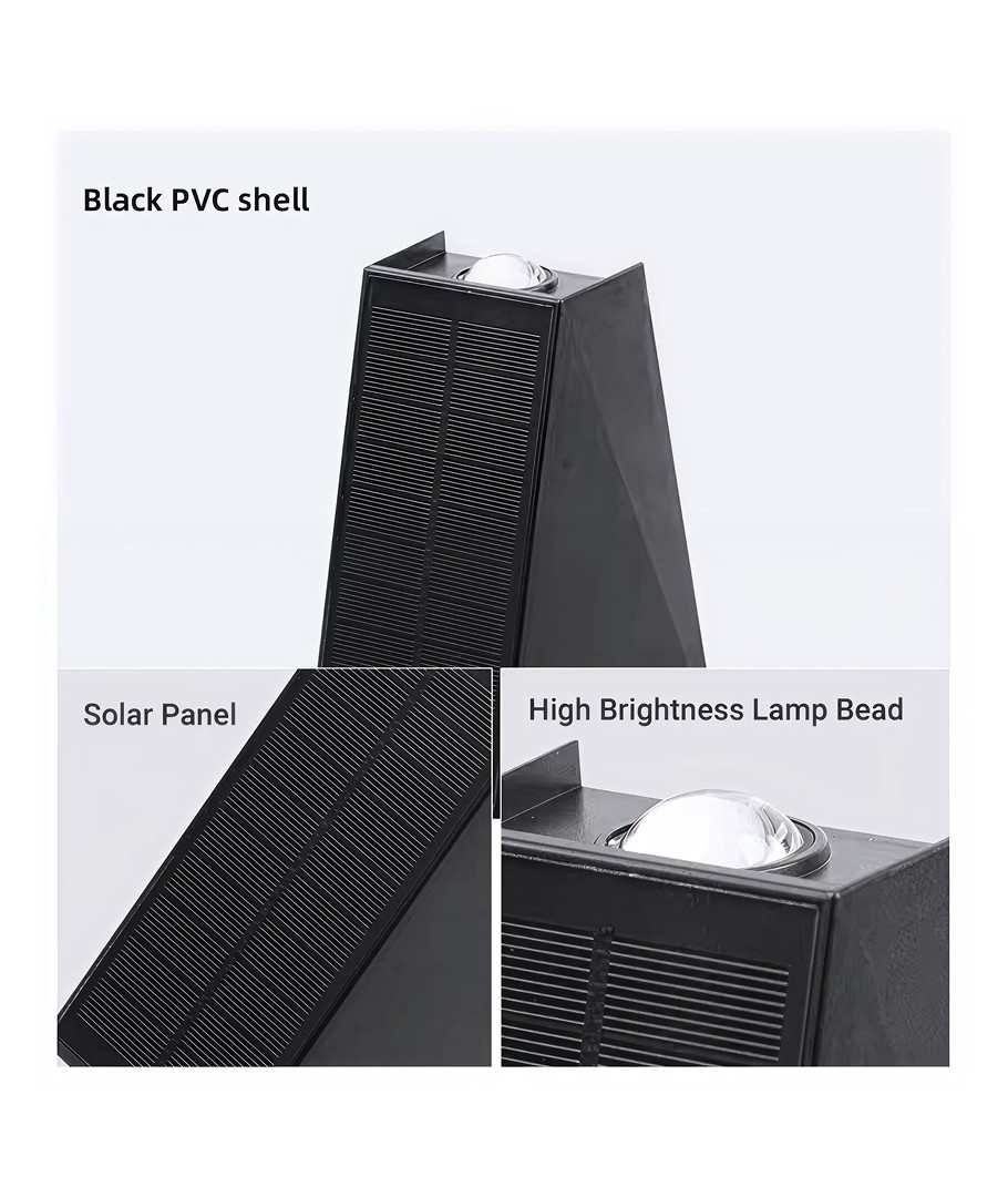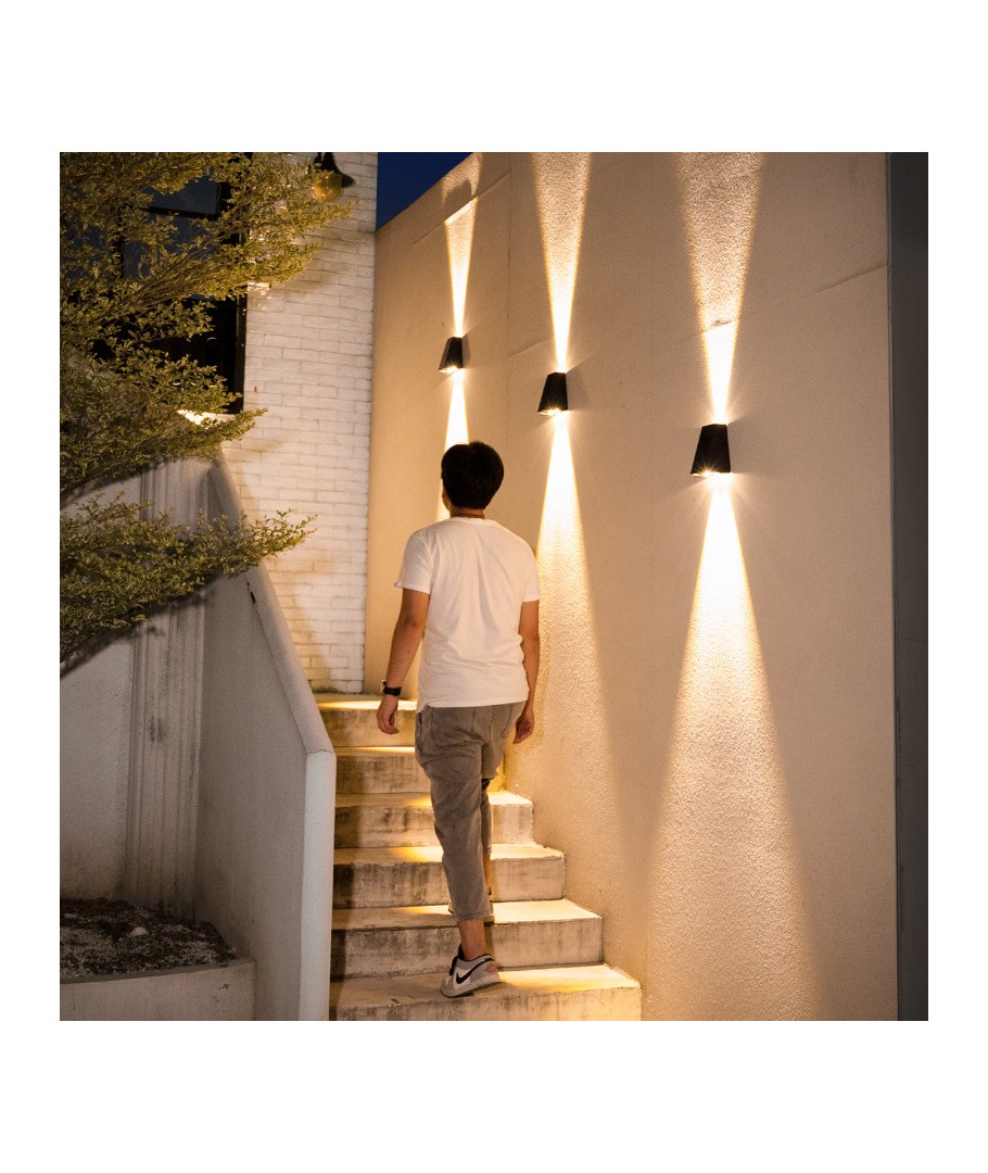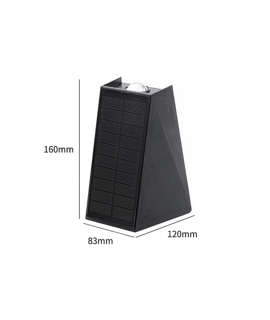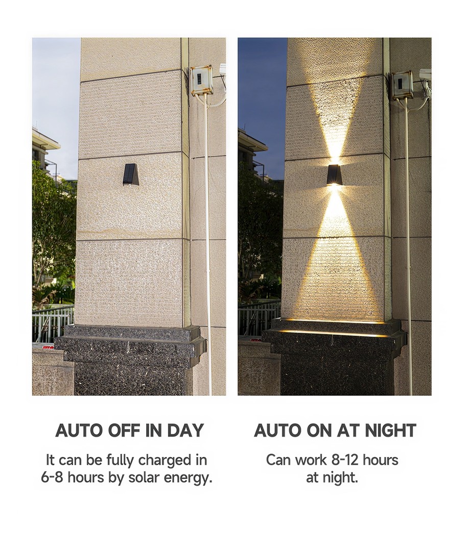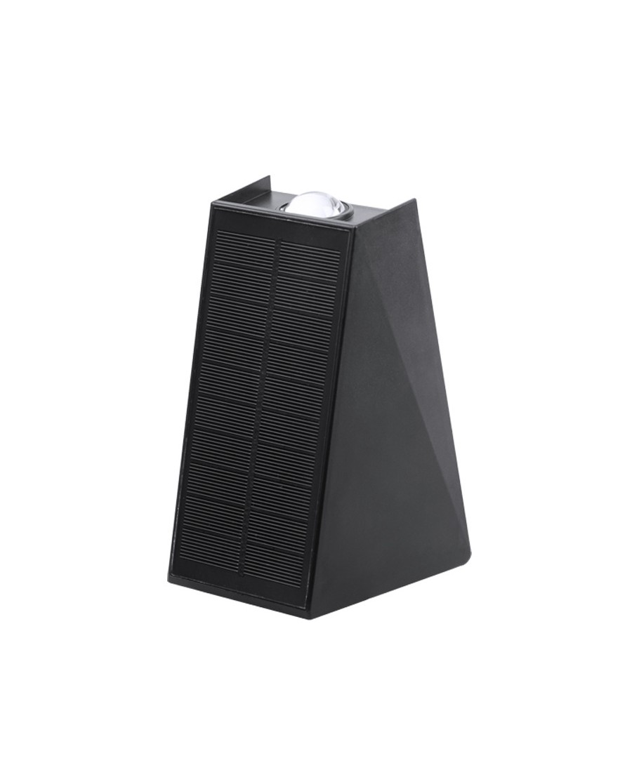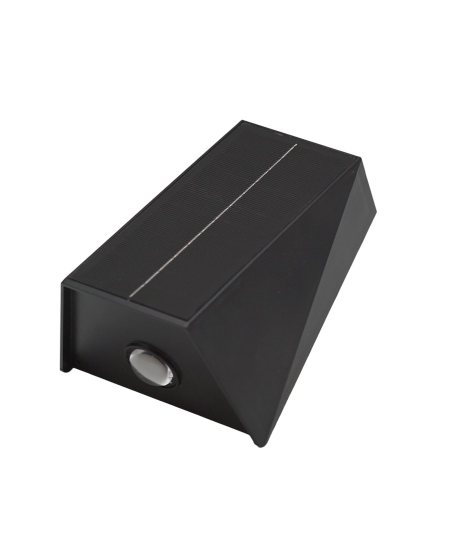 Solcelle væglampe i sort, der er designet til at levere belysning med både op- og nedlys.
