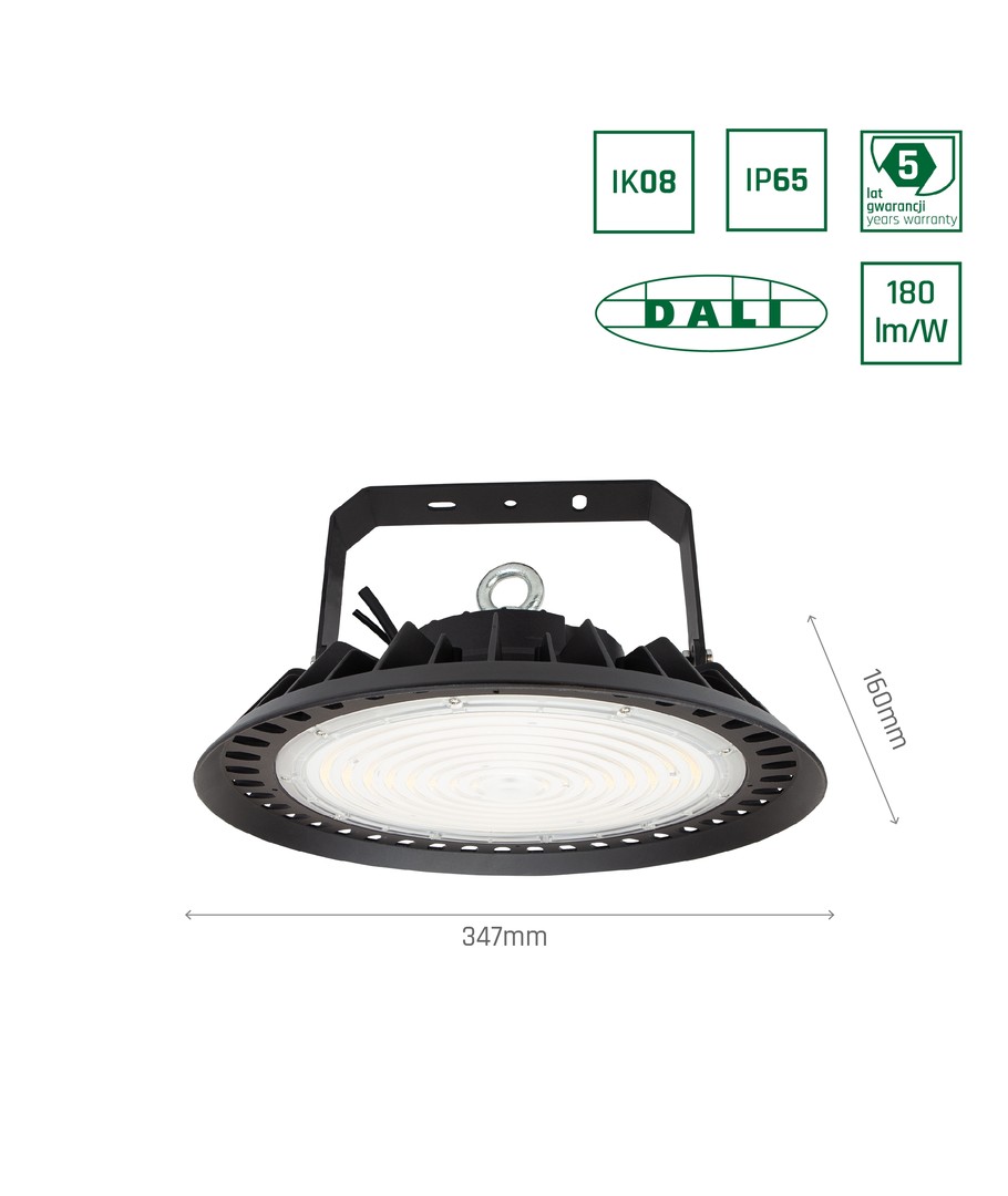 Med en effekt på 200W tilbyder denne LED high bay et imponerende lysudbytte, hvilket gør den til det ideelle valg for store rum, der kræver pålidelig belysning. Den skal tilsluttes en 230V forsyning, hvilket sikrer en stabil drift.