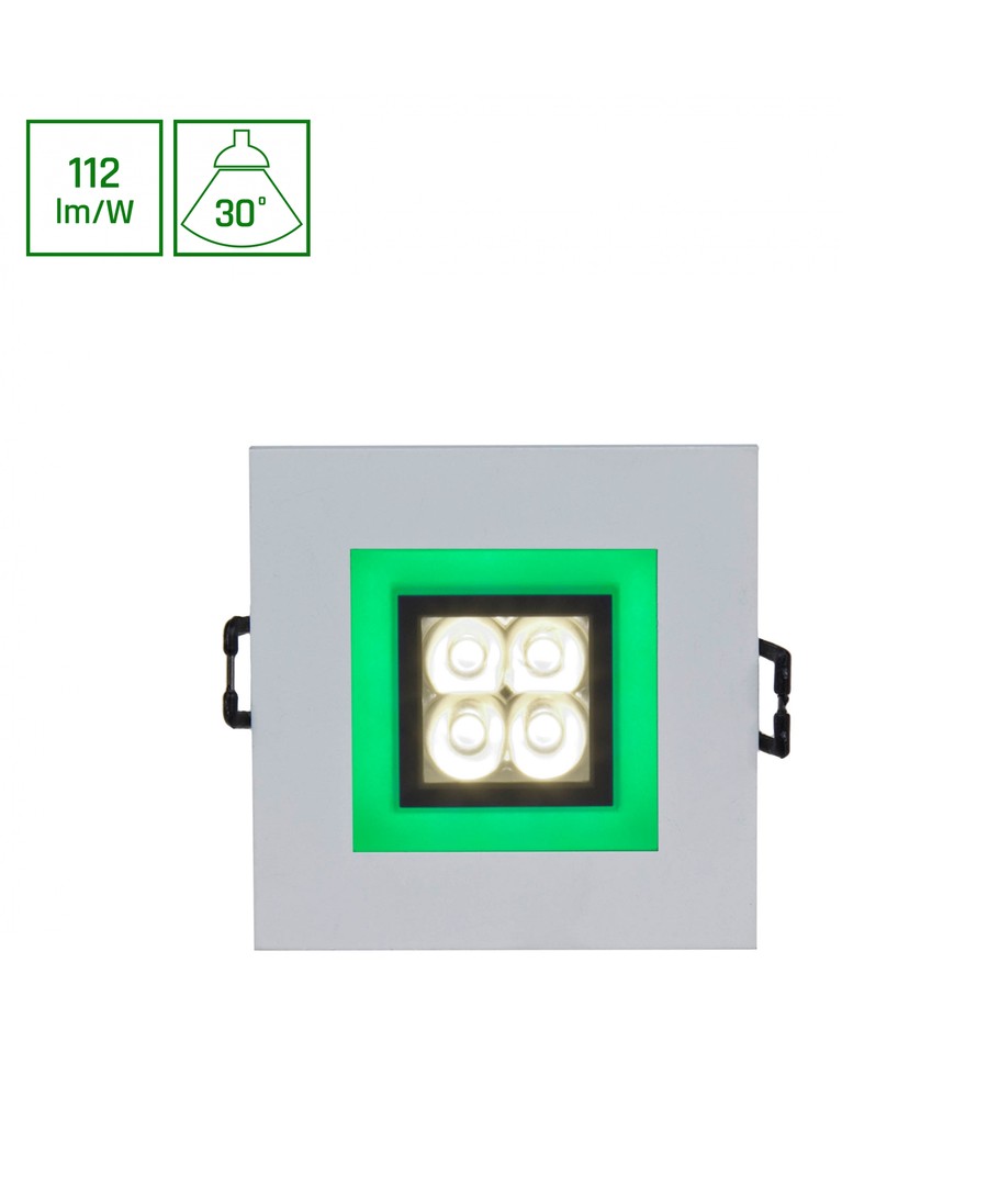 Dette LED spot er designet til at give dig en optimal belysning med sin stilfulde grønne ramme og fire LED'er. Med en effekt på 4W tilbyder det en imponerende lysstyrke på 450 lumens, der kan oplyse ethvert rum med et kontrolleret og fokuseret lys på 30 grader.
