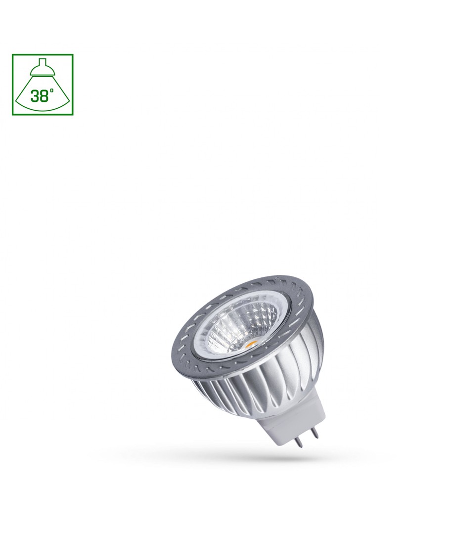 Pæren tilsluttes en 12V DC forsyning, hvilket gør den velegnet til installationer, der kræver lavspændingsbelysning. Med en lysstyrke på 280 lumens tilbyder den en fokuseret belysning med en 38 graders lyskegle, der sikrer et præcist og kontrolleret lysudstråling.