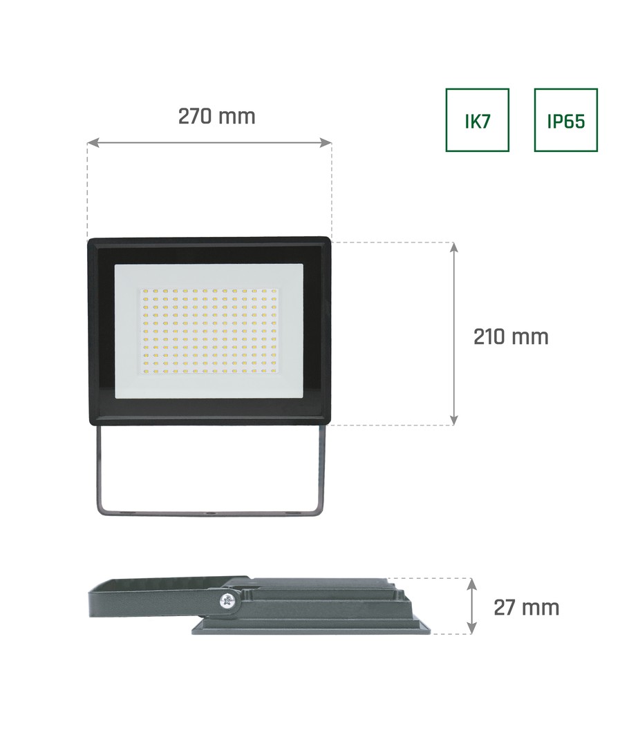 Lyskasteren har en dimension på 270 x 210 x 27 mm og tilsluttes nemt til en 230V forsyning. Den er designet med en integreret lyskilde, hvilket sikrer en let installation og minimale vedligeholdelsesbehov.