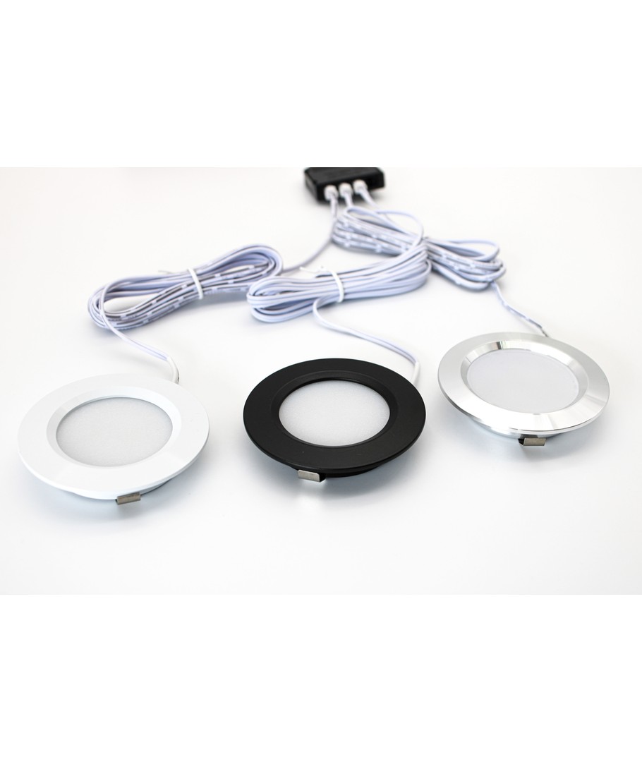 Med dette sæt får du 3 stk. Reco68 møbelspots i børstet stål, samt en dæmpbar 30W strømforsyning, med plads til 10 møbelspots.