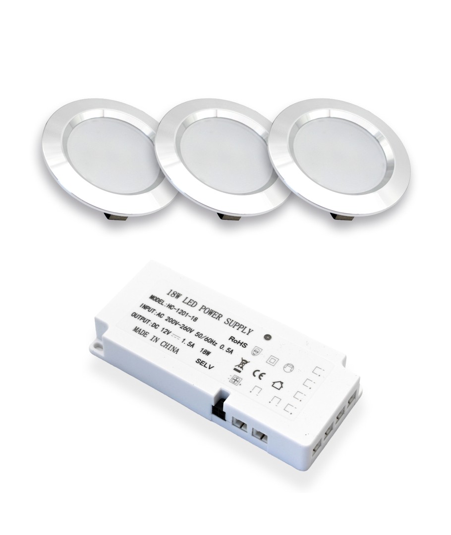 Med dette sæt får du 3 stk. Reco68 møbelspots i børstet stål, samt en 12V DC strømforsyning, med plads til 6 møbelspots.