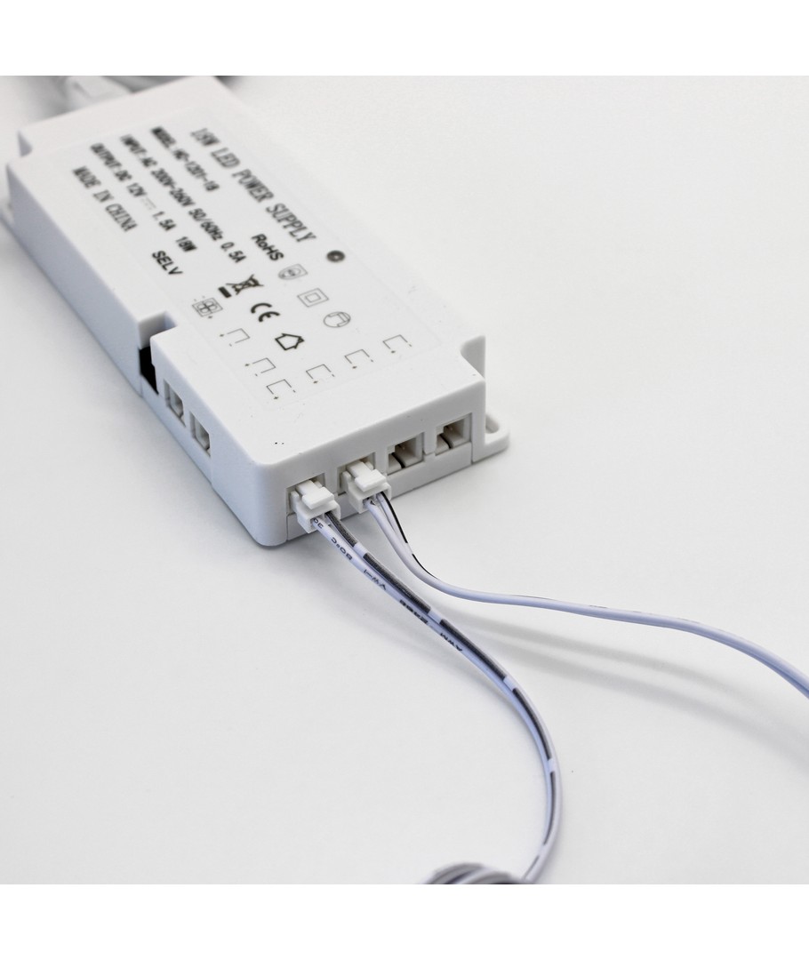 Strømforsyningen har dimensionerne: 120x55x20mm og fylder derfor næsten ingenting. Strømforsyningen kan let skjules ovenpå overskabe mm.