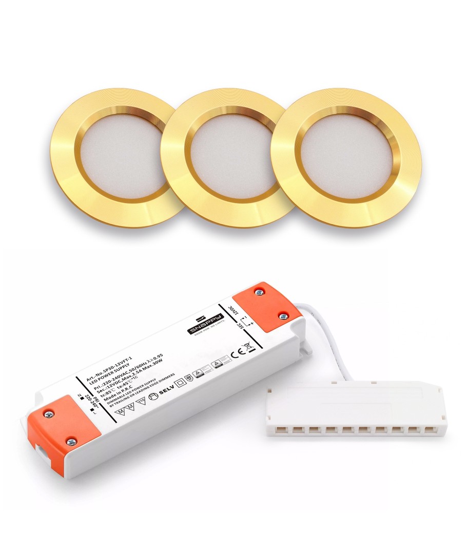 Med dette sæt får du 3 stk. Reco68 møbelspots i guldfarve, samt en dæmpbar 30W strømforsyning, med plads til 10 møbelspots.